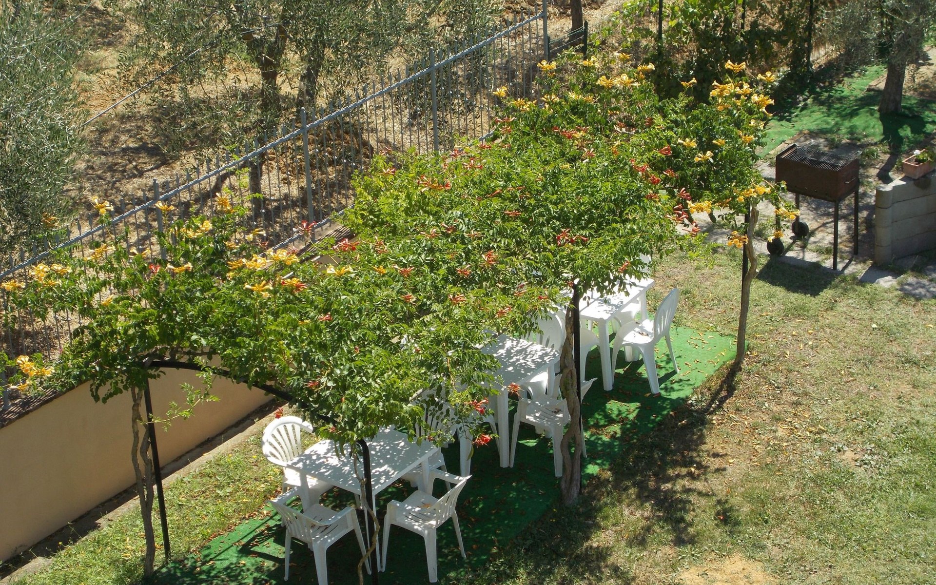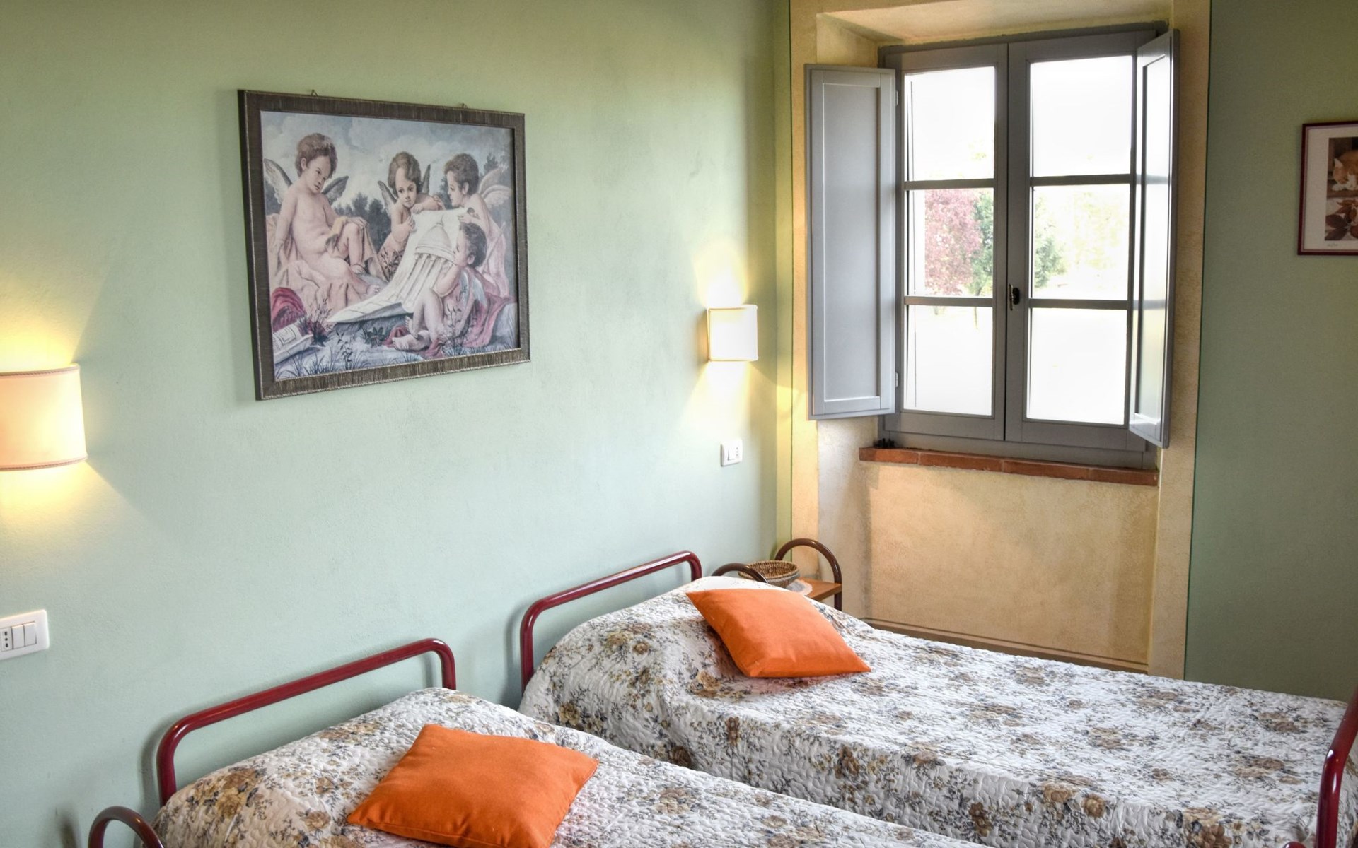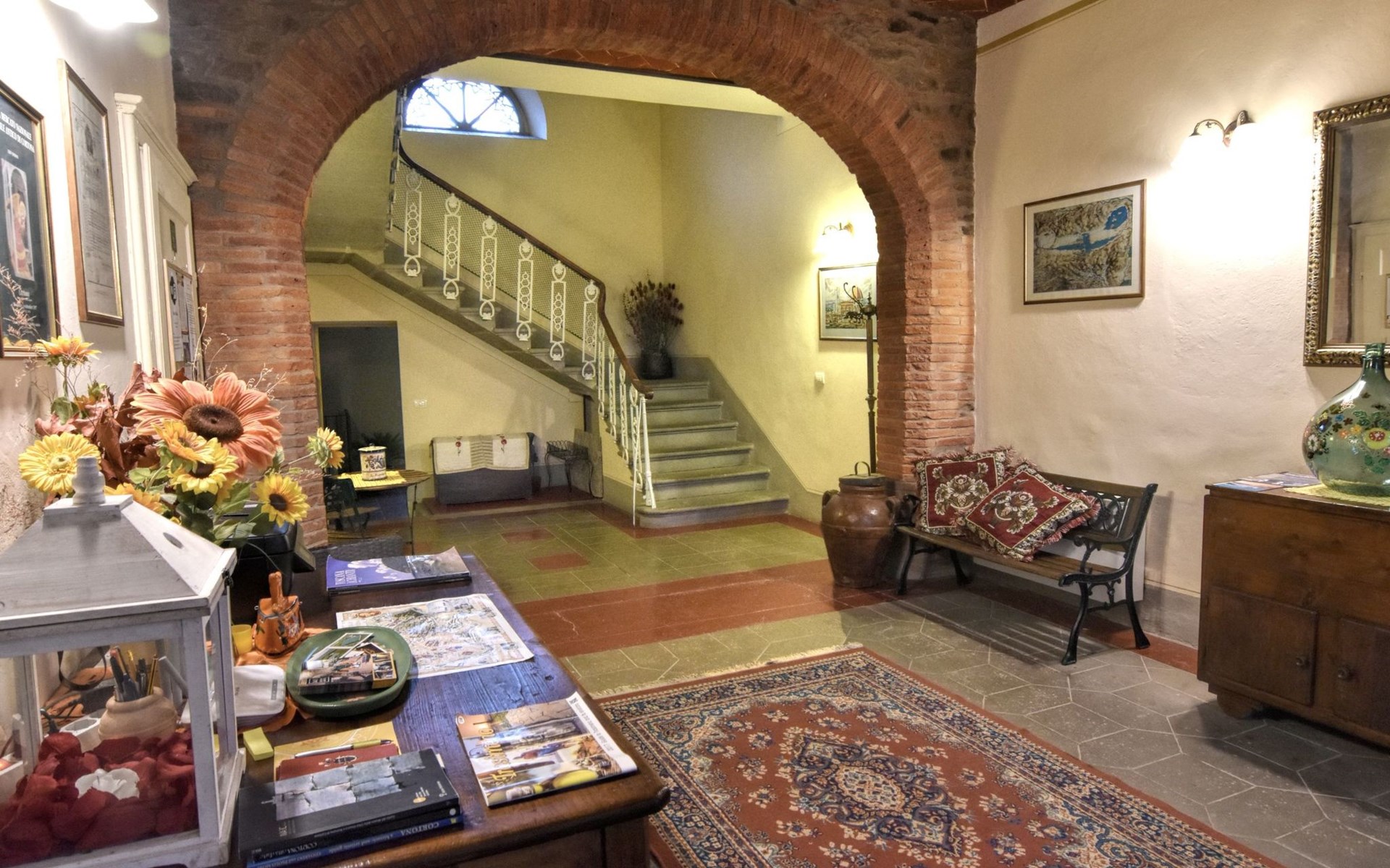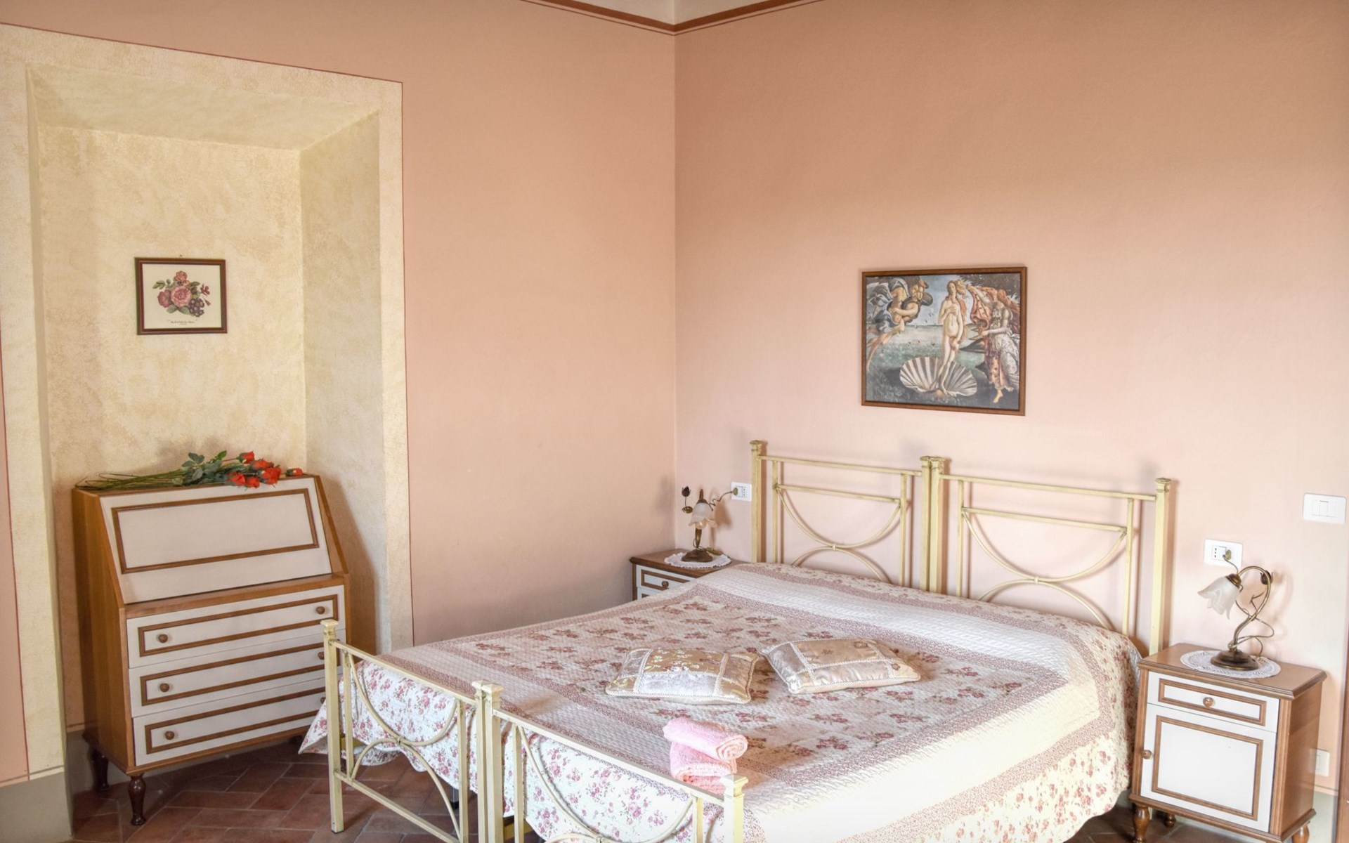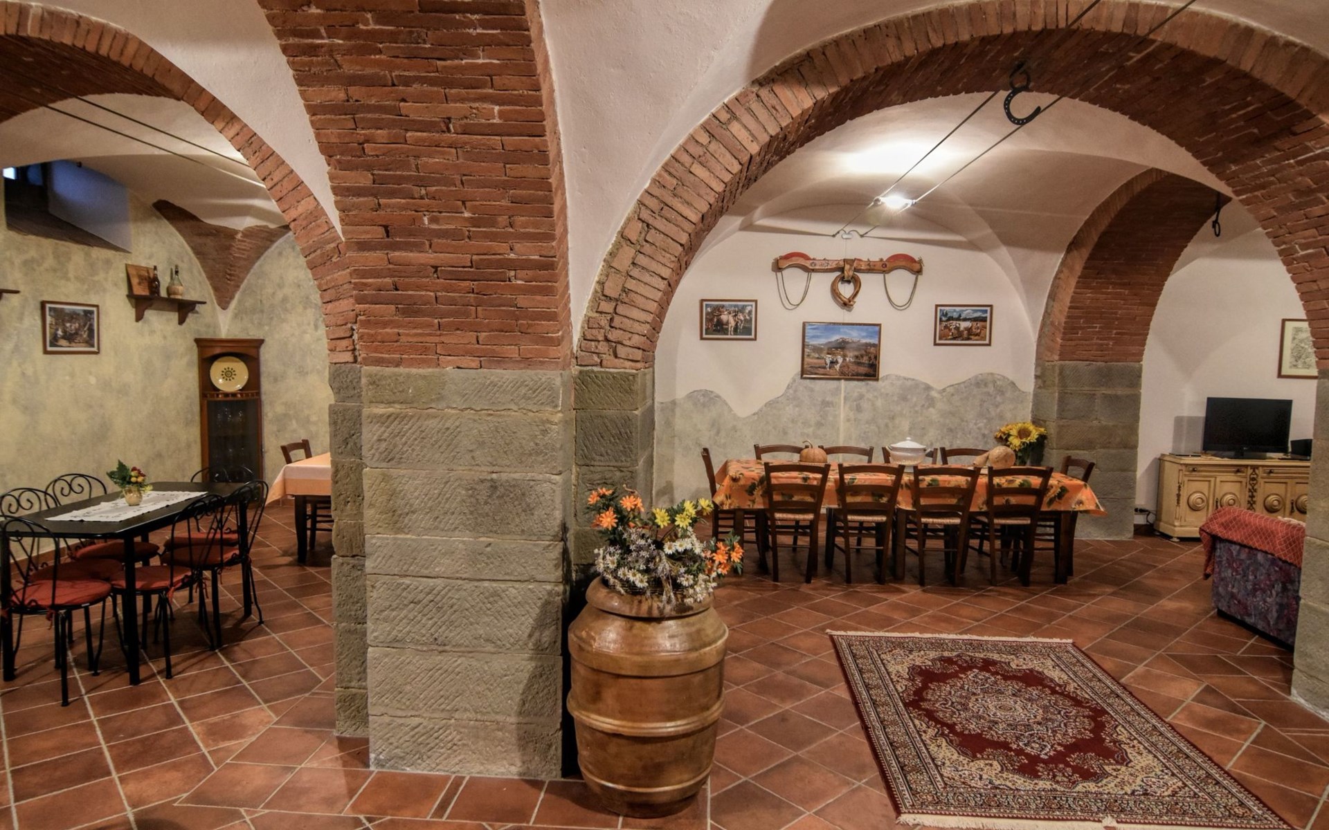 The Palazzo is situated in the Fratta region, a rural area in which a splendid chandelier – one of the most important examples of Etruscan civilization – was discovered. The path of Bonifica Leopoldina, from which you can enjoy a view of Cortona and the surrounding countryside, runs near to the Villa and can be explored on foot, by bicycle or on horseback.There are six apartments of various sizes, each of which contains antique furniture which fits harmoniously together with the vaulted ceilings, the terracotta-tiled floors and the arches, making the villa a beautiful and welcoming place to stay. The bedrooms are painted in warm colours matching the hues of the surrounding countryside. Air conditioning, satellite television and dishwashers are all available.The large garden, which surrounds The Palazzo, is equipped with chairs and tables, beach umbrellas, sunbeds, children’s games, bicycles, barbecue equipment and a beautiful swimming pool for the exclusive use of guests.The villa’s enchanting location, surrounded by orchards and farmland, makes it an ideal place for holidays, offering exquisite sunrises and breathtaking sunsets.Villa Il Palazzo is not far from the most beautiful towns and cities in Tuscany and Umbria, such as Florence, Siena, Arezzo, Pienza, Montepulciano, Montalcino, Lake Trasimeno, Perugia, Assisi, Gubbio, Orvieto, Spoleto, etc…. IT051017C23E6JCLDI