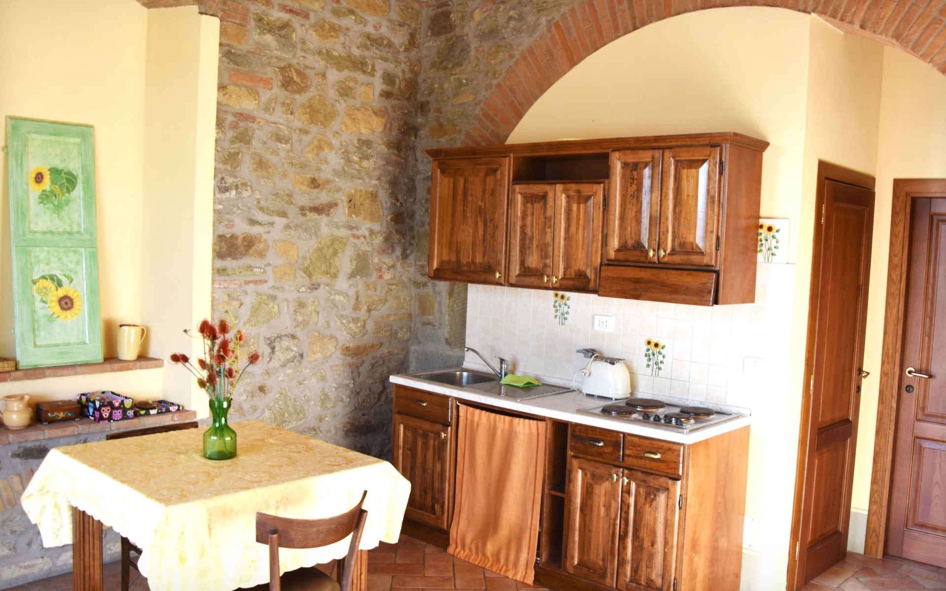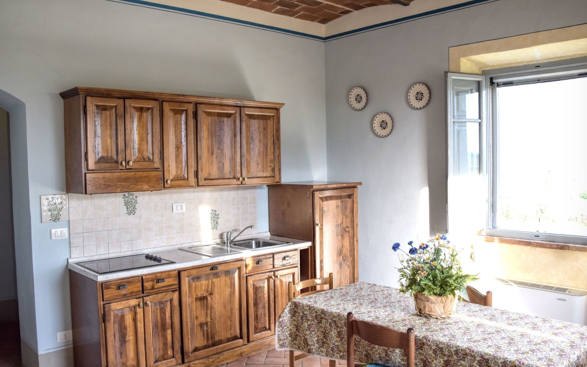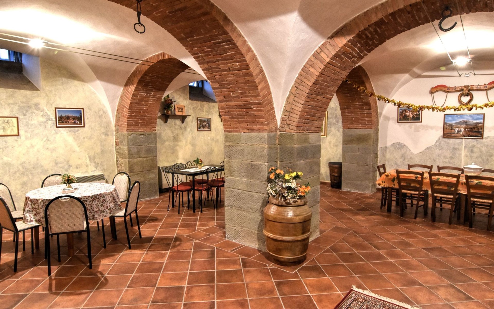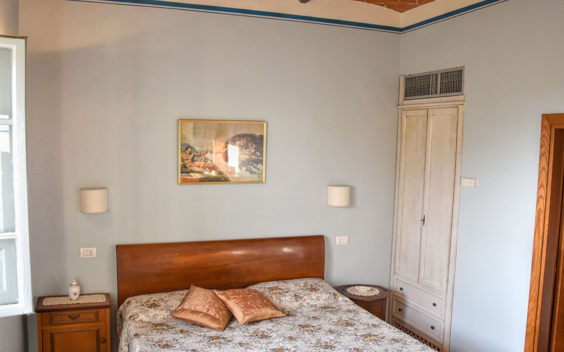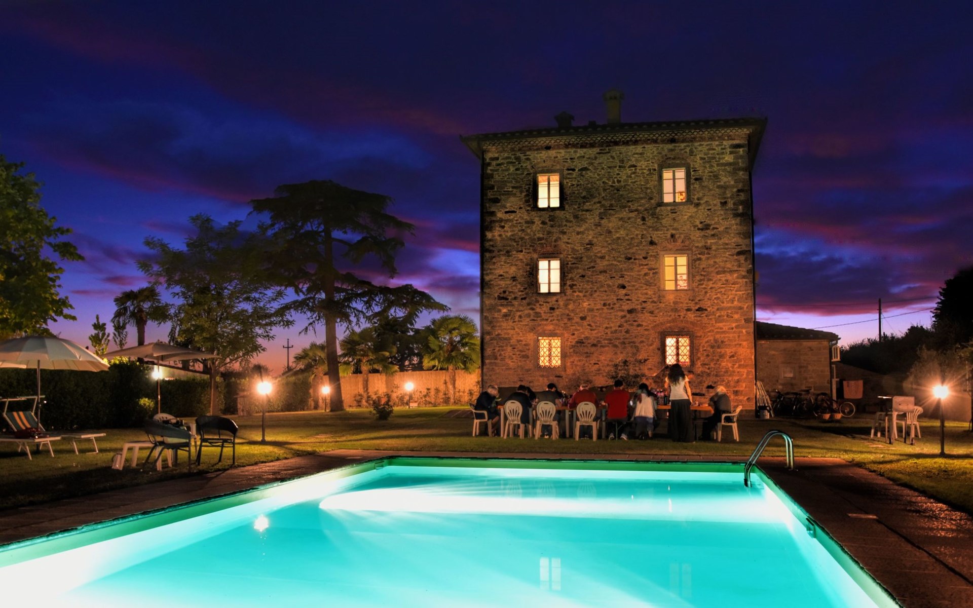 The Palazzo is situated in the Fratta region, a rural area in which a splendid chandelier – one of the most important examples of Etruscan civilization – was discovered. The path of Bonifica Leopoldina, from which you can enjoy a view of Cortona and the surrounding countryside, runs near to the Villa and can be explored on foot, by bicycle or on horseback.There are six apartments of various sizes, each of which contains antique furniture which fits harmoniously together with the vaulted ceilings, the terracotta-tiled floors and the arches, making the villa a beautiful and welcoming place to stay. The bedrooms are painted in warm colours matching the hues of the surrounding countryside. Air conditioning, satellite television and dishwashers are all available.The large garden, which surrounds The Palazzo, is equipped with chairs and tables, beach umbrellas, sunbeds, children’s games, bicycles, barbecue equipment and a beautiful swimming pool for the exclusive use of guests.The villa’s enchanting location, surrounded by orchards and farmland, makes it an ideal place for holidays, offering exquisite sunrises and breathtaking sunsets.Villa Il Palazzo is not far from the most beautiful towns and cities in Tuscany and Umbria, such as Florence, Siena, Arezzo, Pienza, Montepulciano, Montalcino, Lake Trasimeno, Perugia, Assisi, Gubbio, Orvieto, Spoleto, etc…. IT051017C23E6JCLDI