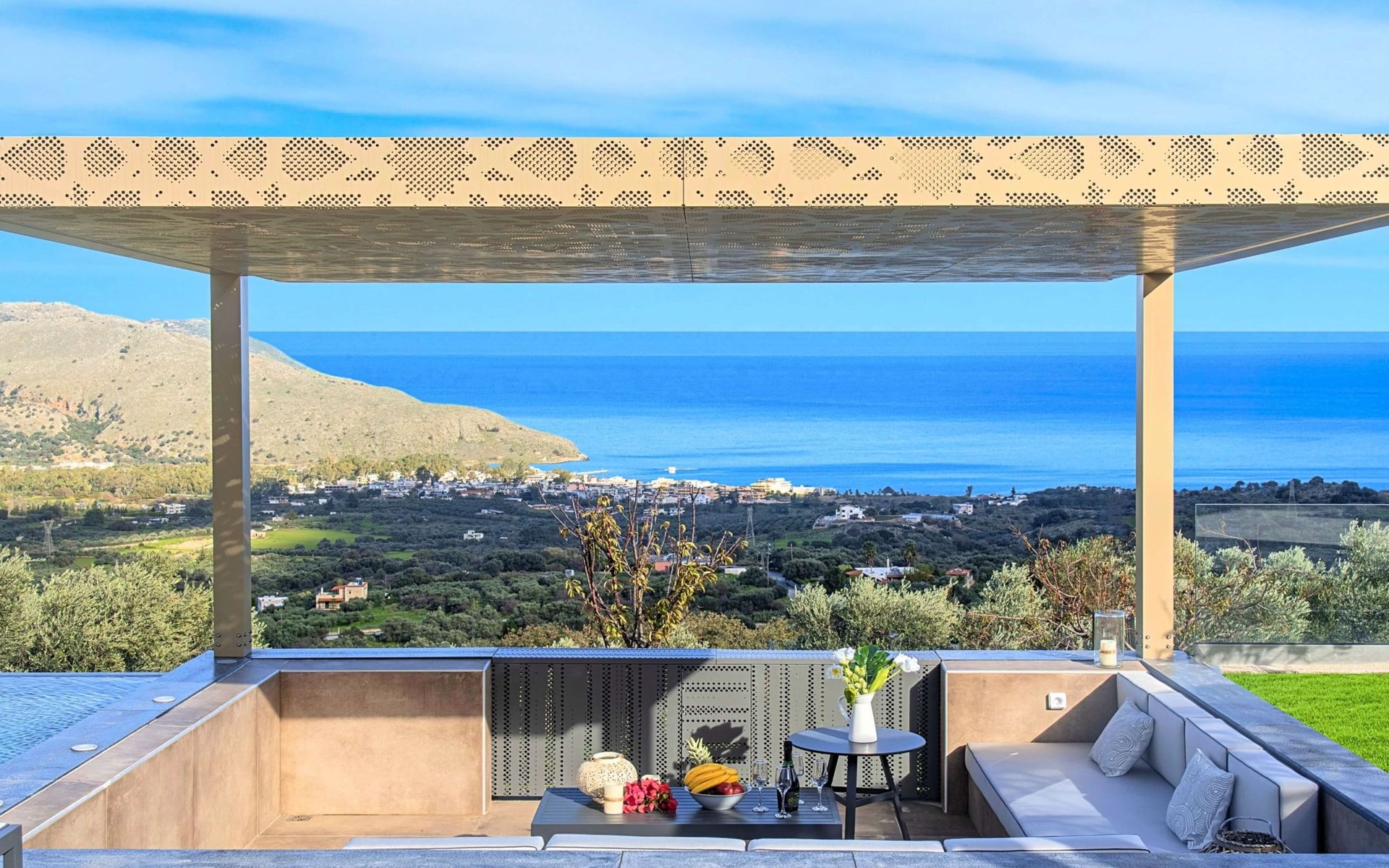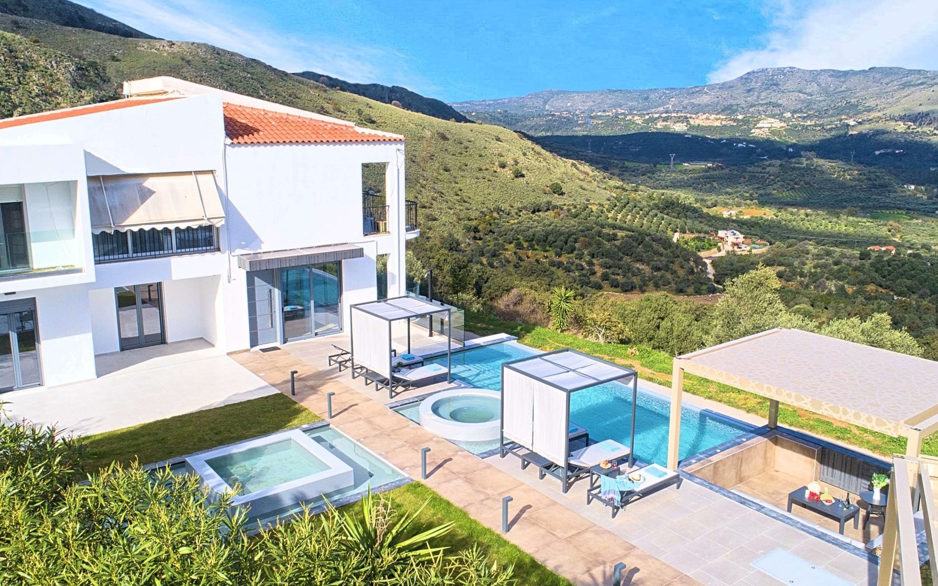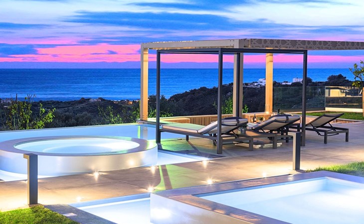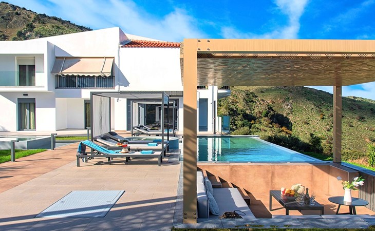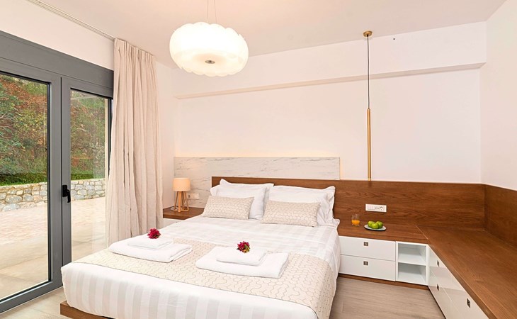 Mistral Suite is an extraordinary three-bedroom luxurious home, ideal for a unique relaxing holiday experience.At the beautiful area of Apokoronas, in the village of Mathes, overlooking olive groves, vineyards and the endless blue of the Cretan Sea.Live an ultimate journey during your stay, live an experience that fuses Cretan chariness with all the comforts of a luxury boutique hotel Suite.Blending seamlessly with its luscious verdant surroundings, has been designed and built as an environmentally friendly home, offering a totally authentic Greek hospitality experience.All in a single gorgeous location a few hundred meters from the largest sandy beach of Crete and the only natural lake of Crete, Kournas.Unwind in the infinity pool surrounded by the large sunbath area.Enjoy a drink at the outdoors sitting area and leave your eyes to explore the endless blue of the sea and the sky.Slipping into your room, will be like stepping into a stylish hotel room, with all the necessary amenities, all complemented by refined style furniture.An oasis of glorious island serenity awaits you at Mistral Suite, so start planning your escape today.Perfect for families or group of friends.Mistral Suite is a detached apartment of two independent apartment building, owned by the same family. With private entrance, private parking, private large garden area with private use of an infinity swimming pool. ● Private parking area.● Direct access to the swimming pool area. The outdoor pool is heated and can reach 6 to 8 degrees more that the 24 h average air temperature with maximum value of 29°CFacilities● A living room with a large Corner Sofa (can accommodate up to two quests) with direct access to the terrace and the pool area● A fully equipped Kitchen with an oven, microwave dishwasher, a fridge, a coffee maker, tea facilities, a toaster, a kettle and dining facilities.● A large bathroom with walking separate shower area.● A bedroom with a queen-size double bed and direct access to the pool and the outdoor sitting area.● A large bathroom with walking separate shower area.● A second bedroom with two twin push together single beds and direct access to the garden, the pool and the outdoor sitting area.● A third bedroom with a queen-size double bed and direct access to the garden.General Facilities● Smart TV at the living room.● Air-conditioning in all areas.● Free Wi-Fi internet access.● Outdoor sitting area with comfortable sofas.● Portable BBQ● Private infinity Swimming pool with whirlpool and children section.● Sun lounge area● Washing machine / Dryer.● Iron and ironing board.● Safe deposit box.● Hair dryer in both bathrooms.● Linen and towels.● Toiletries.● Swimming pool towels.● Baby cot.● High chair for children.● Towels and bed linen changed and cleaned every 3 or 4 days.There are several sandy beaches along the coast at Georgioupoli where swimming is sheltered with a breakwater. It has the longest beach on the island, with over nine kilometres of golden sand. There is abundant wildlife in the area attracted by the river and surrounding semi-wetland. Loggerhead turtles have been known to lay eggs on some of the local beaches. There are various activities available including boat trips, horse riding, bike tours and even a small tourist train than transports visitors from the sea front to places of interest including Lake Kournas.Boat tripsHorse ridingLong expanse of sandy Blue Flag beachesWatersportsLocal guided walks and mountain bike hireExcellent choice of cafes and tavernas, many with free WIFILake Kournas – Cretes only freshwater lakeThe pretty village nearby of Argiroupolis and Roman LappaMini markets and 2 ATM machinesGeorgioupolis is found at the apex of Almiros Bay on the Sea of Crete, with Cape Drapano and its rocky coast to the north and the long sandy beaches towards Rethimno in the east, just 20 km away. Three rivers meet the sea at the village; the largest, Almiros, creates a small harbour for fishing and tourist boats. The entrance to the village on the old road from Vrisses is a long avenue of eucalyptus treeGeorgioupoli or Georgioupolis (Greek: Γεωργιούπολη) is a village and resort on the Greek island of Crete. It is located 43 km east of Chania, about 22 km west of Rethymno and about 100 km west of Heraklio in the Apokoronas region. It was named after Prince George of Greece, high commissioner of the island in the last years of Ottoman occupation.Formerly a small fishing village, Georgioupolis is very much a tourist town now, with many cafés, tavernas and small hotels and apartment blocks. The town square is surrounded by outdoor seating used by tourists and locals alike, enjoying their drinks and ice creams. The 9 km beach is the main attraction of the area, with Kalyvaki beach on the other side of the river as well. Nearby Lake Kournas is also a popular excursion by foot, bicycle or tourist ‘train’. Georgioupolis is a well-located base for exploring the traditional villages of the area towards Vamos or into the White Mountains to the south.You are kindly requested to contact us few days in advance so we can organise your private check in at the villa. Your flight details are requested. 00001154321