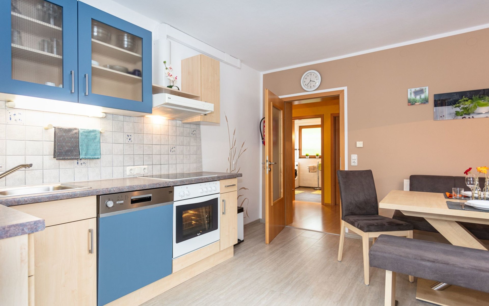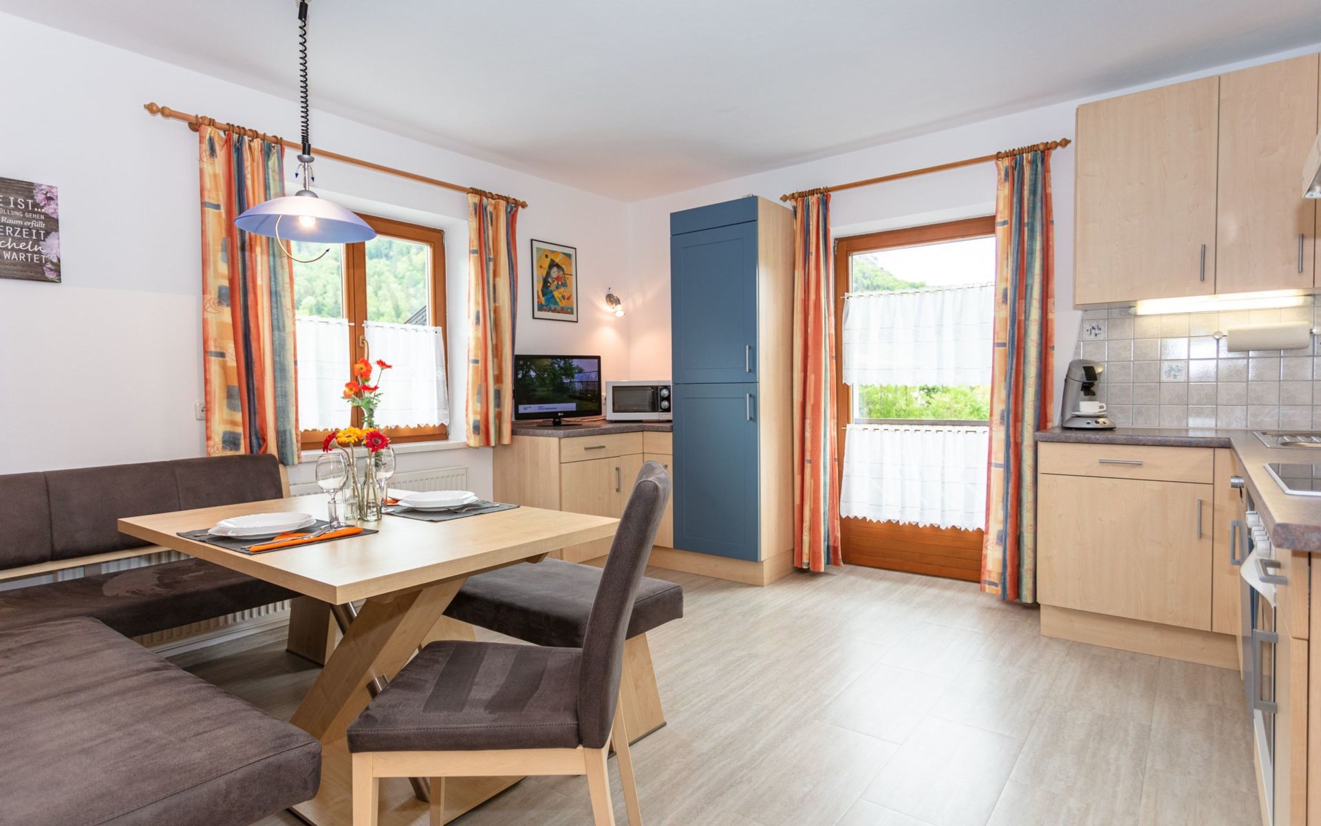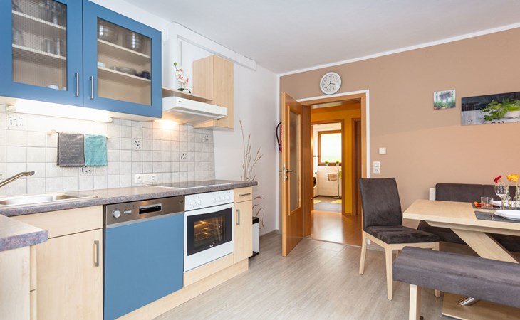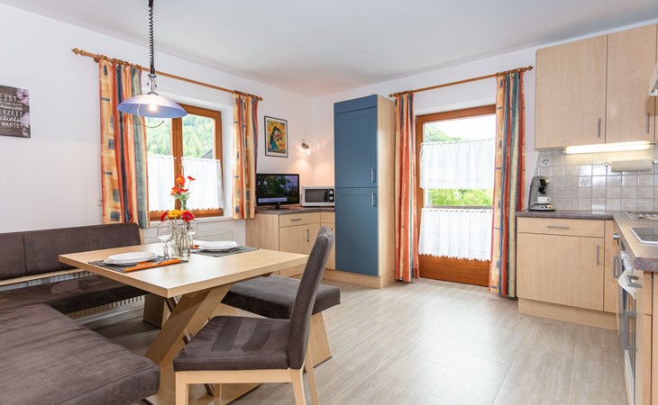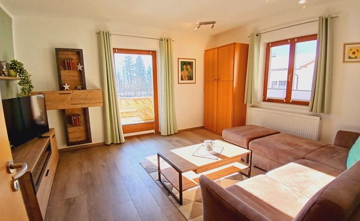 Discover our exclusive comfort flat, awarded "4 Edelweiss" for its high standard and modern facilities. Situated in Winkl, a sunny and quiet part of the village, our flat with south-facing balcony, self-catering and an exclusive wellness corner offers everything you need for a relaxing holiday. Surrounded by clear mountain air, you can enjoy a breathtaking panoramic view of the Kaiser Mountains and find yourself in the immediate vicinity of via ferratas and ideal starting points for hikes. A perfect place to get away from the stress of everyday life and enjoy nature to the full.Our flat, located on the first floor, covers an area of approx. 70m². The cosy eat-in kitchen is fully equipped with an electric cooker, oven, microwave, Senseo coffee machine, toaster and kettle - everything you need for self-catering. An inviting dining area and a flatscreen TV make the room perfect for cosy evenings in. The adjoining bathroom has a shower, washbasin, hairdryer and washer/dryer. The separate WC and a comfortably furnished bedroom with an extra bed and space for a cot complete the interior of our flat.Outside, a spacious balcony facing south-west invites you to relax. Equipped with a table, chairs and a parasol, you can enjoy the sun and the tranquillity of Winkl here. The flat also offers easy access with no incline and includes amenities such as free Wi-Fi and a handy ski boot dryer to make your stay as comfortable as possible.In the immediate vicinity of our house you will find attractive leisure activities. The lake is only about 1 km away, and we offer free bathing tickets for the lake promenade, the eastern shore and the outdoor pools in Kössen and Reit im Winkl. Explore the village centre with its shopping facilities and restaurants, which can be reached in about 15 minutes on foot. There is also a riding stable, a tennis centre and several golf courses in the immediate vicinity, offering every guest the opportunity to pursue their individual interests.Enjoy the uniqueness of our flat, where comfort meets idyllic nature. Whether you want to relax in the wellness corner, enjoy the breathtaking view from the balcony or explore the surrounding countryside - our flat offers the ideal retreat for an unforgettable holiday. Leave everyday life behind you and immerse yourself in the beauty and tranquillity of Winkl.