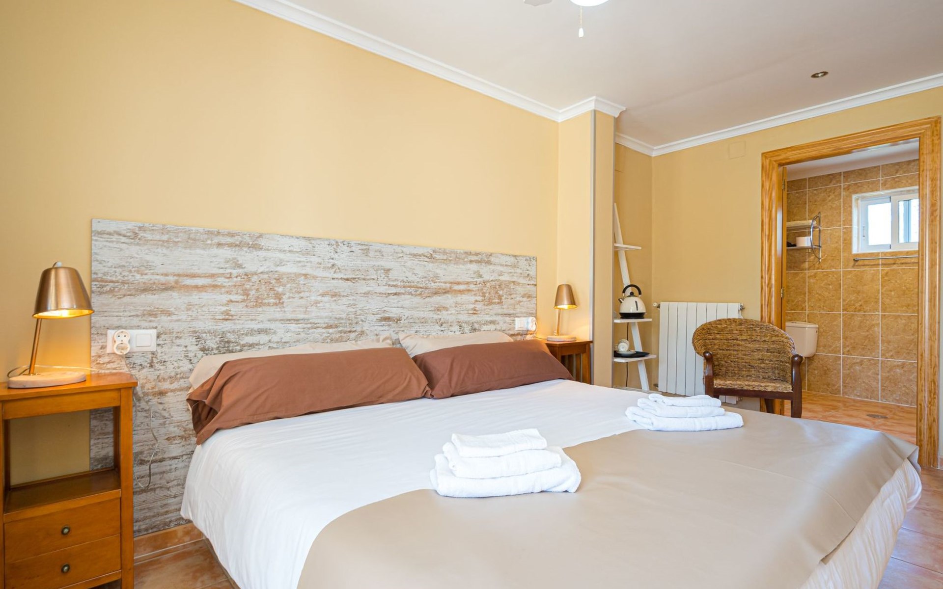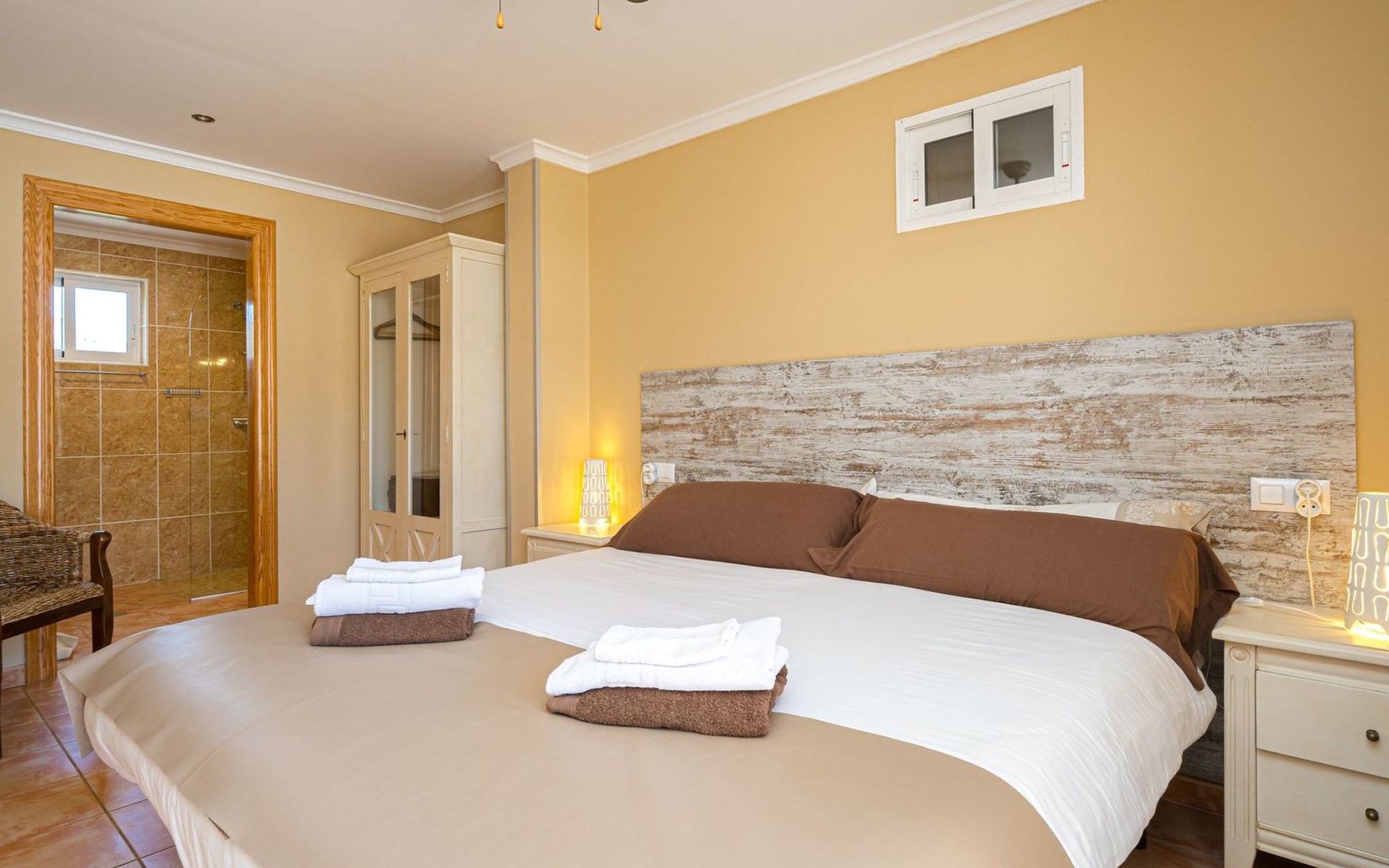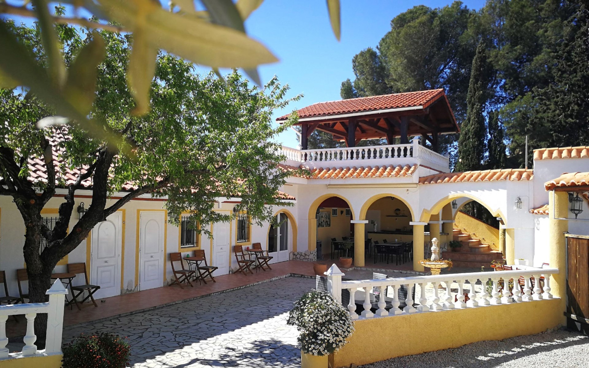 Binnen op ons terrein verwelkomt de finca u met vijf sfeervolle tweepersoonskamers, elk uitgerust met een en suite badkamer, moderne faciliteiten zoals zeep & shampoo, een föhn, koffie- & theevoorzieningen, een kluisje, en een plafondventilator met ledverlichting en afstandsbediening. Voor de koelere avonden is er centrale verwarming beschikbaar( extra toeslag). De algemene woonkamer is voorzien van airconditioning, een flatscreen tv met sateliet TV, Nederlandstalige kanalen en Netflix, en een professioneel uitgeruste keuken, waardoor het een perfecte plek is om samen te komen.