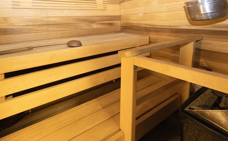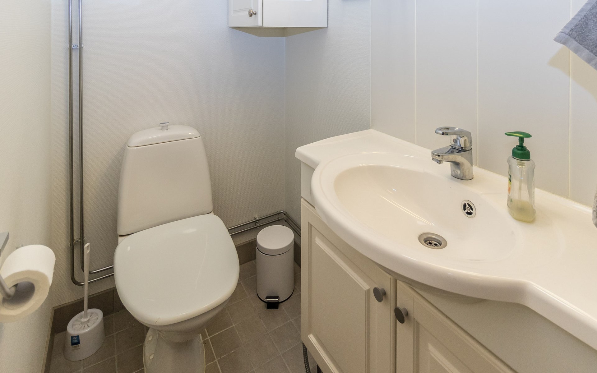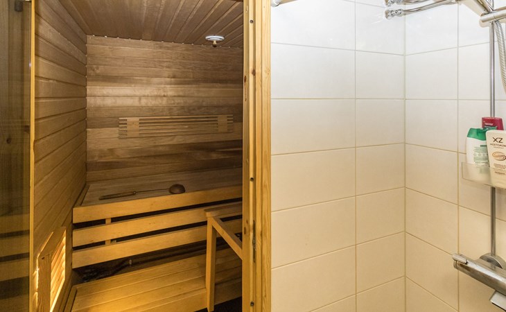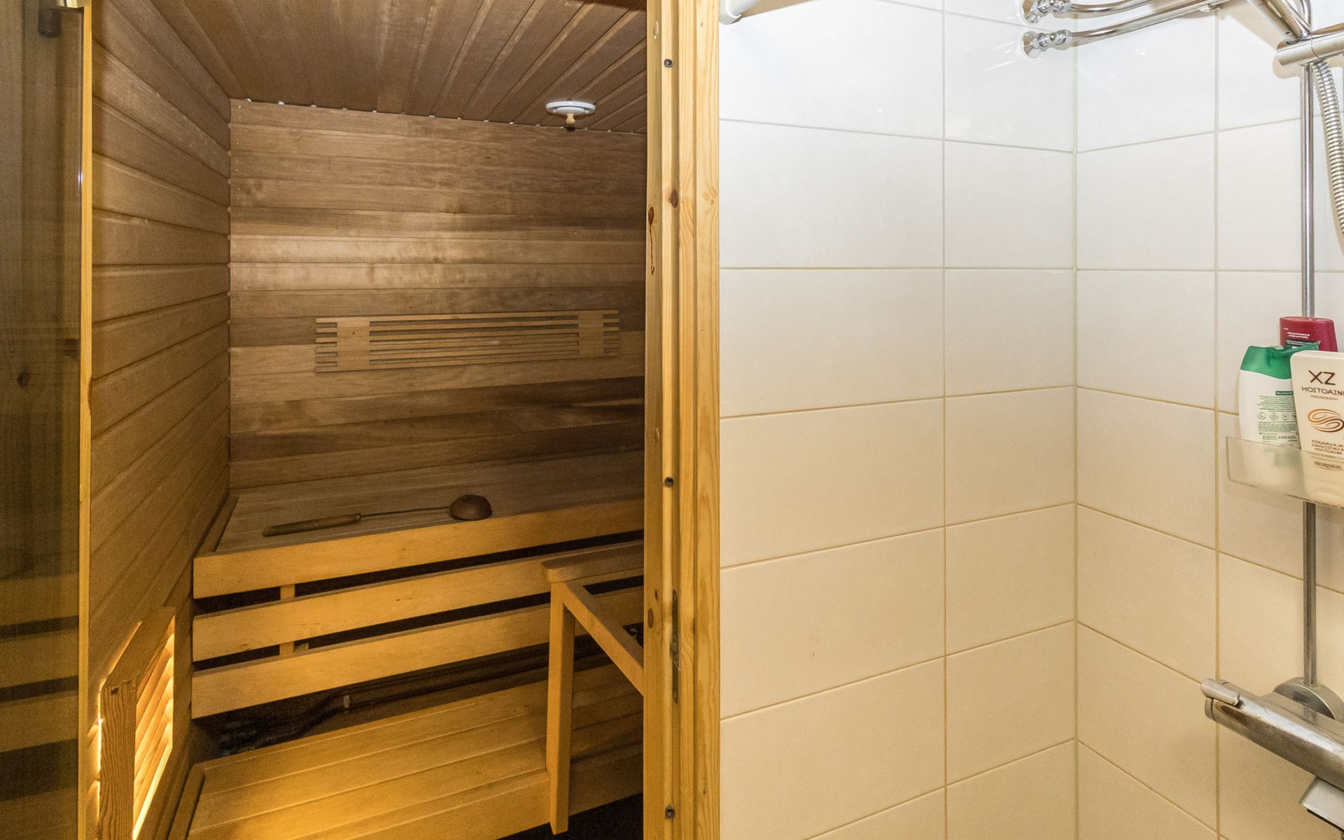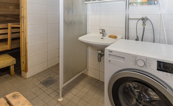 The sauna steams crown the day's outdoor activities, and the laundry room also has a washing machine for longer stays. A separate toilet brings everyday comfort.
