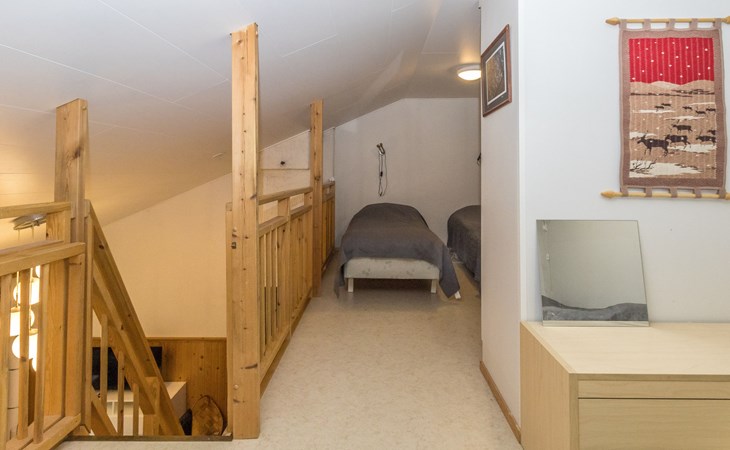 The sleeping areas are suitable for both families and small groups: one bedroom with a 160 cm double bed, and a spacious loft with three 80 cm wide beds.
