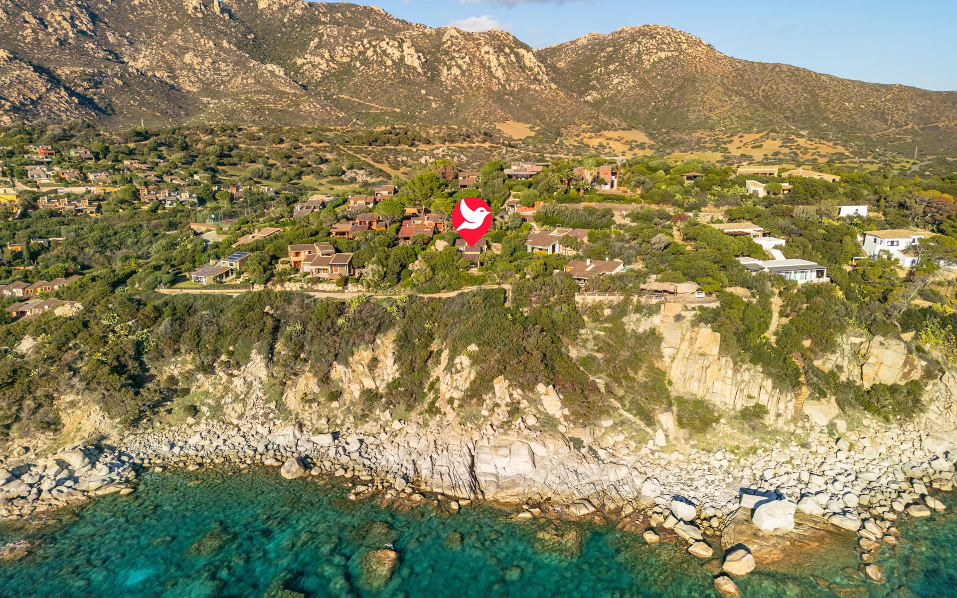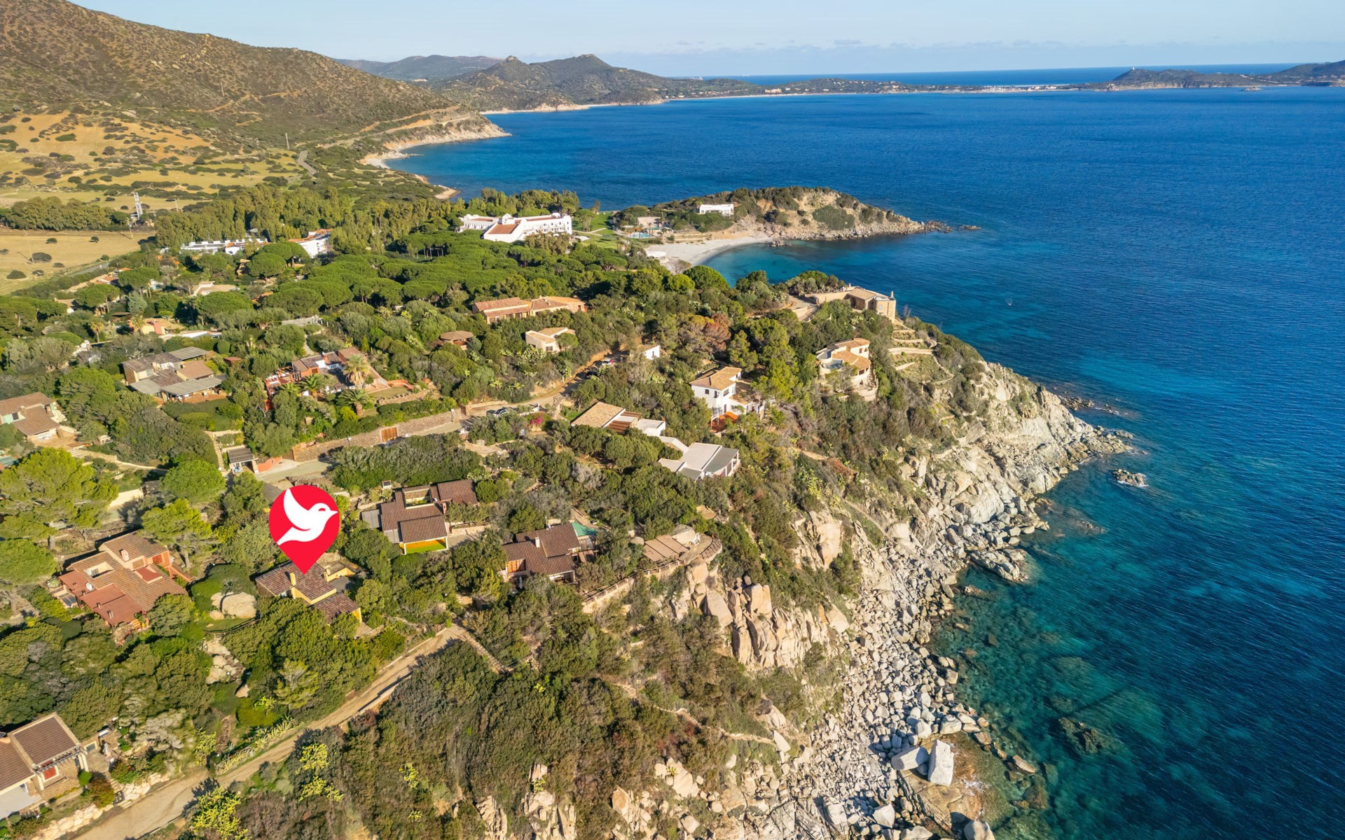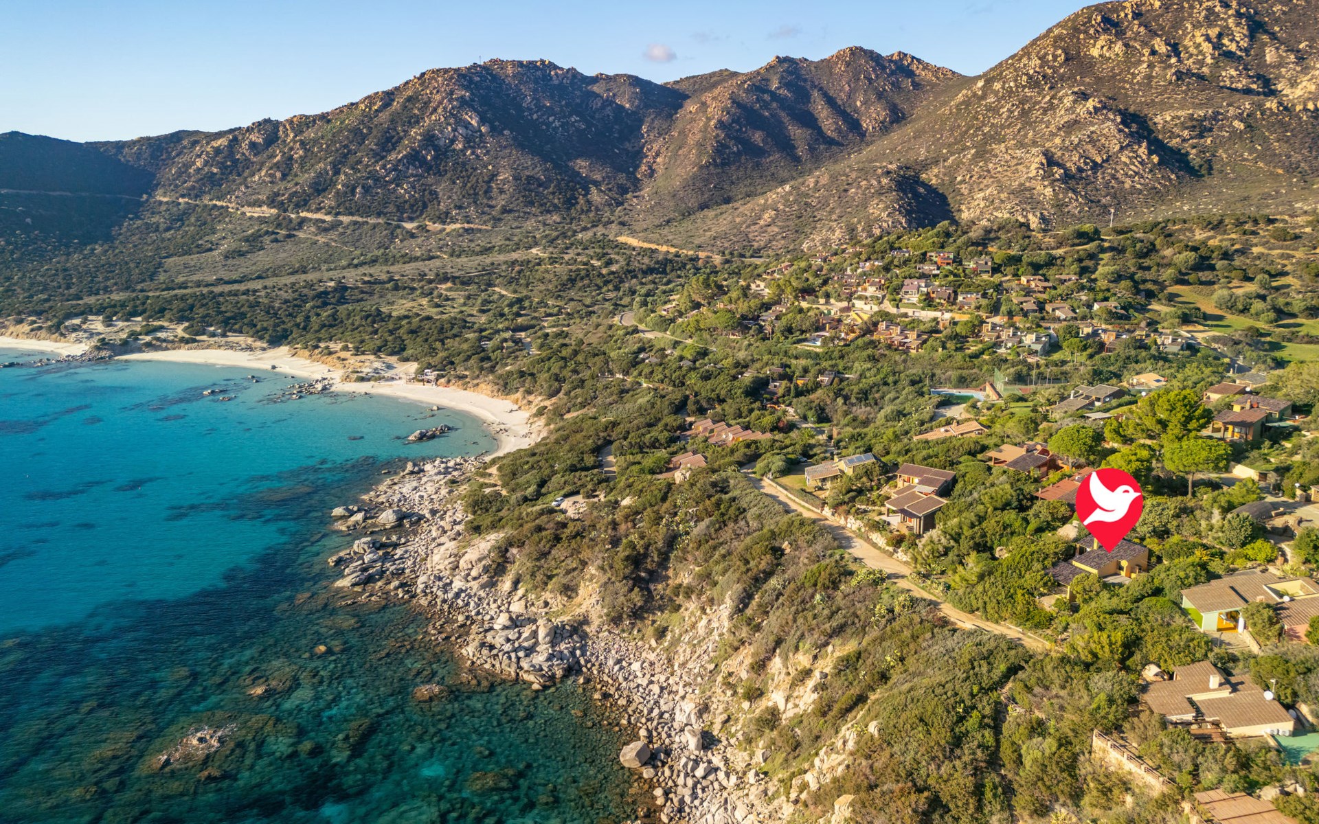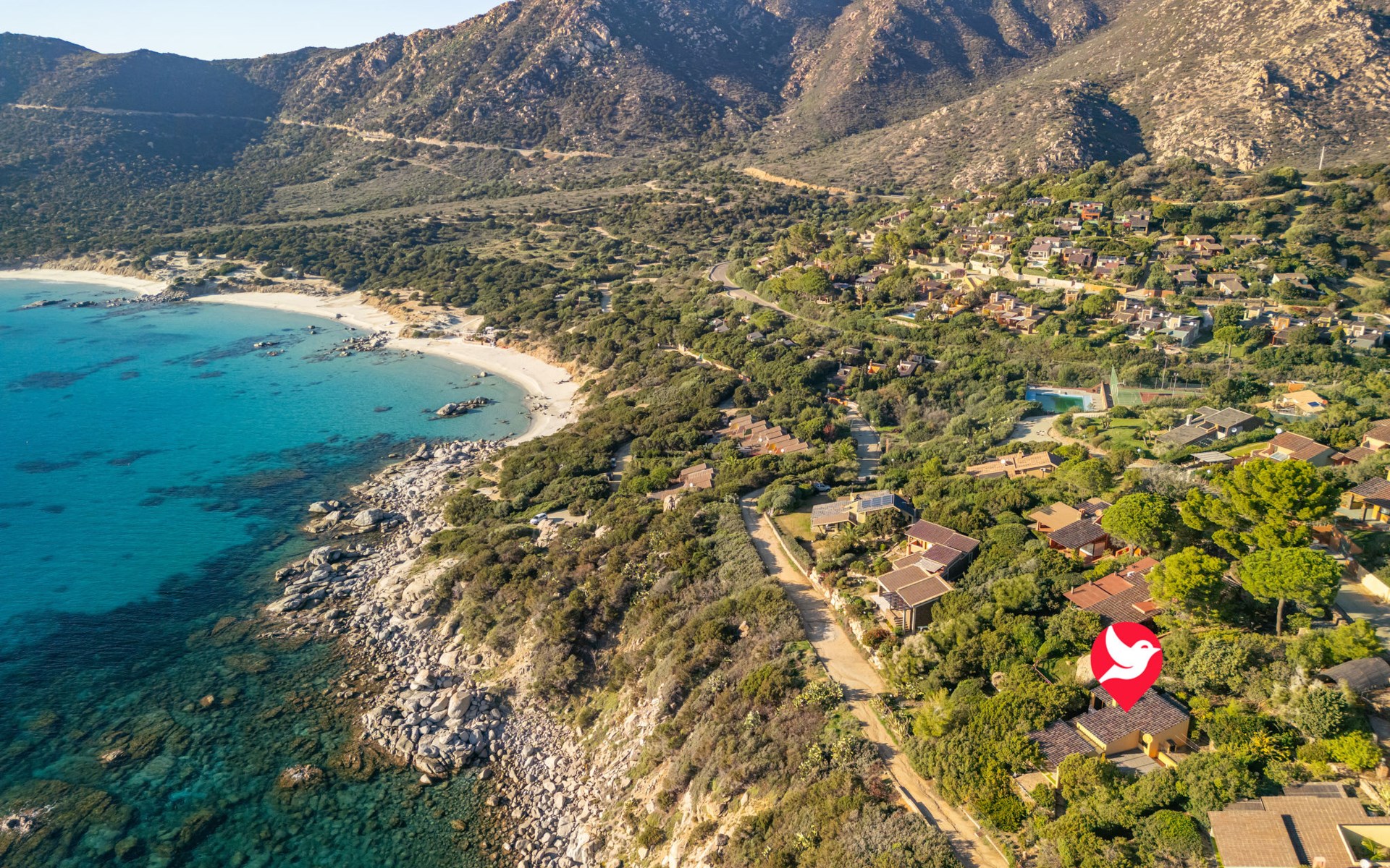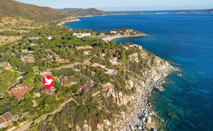 Mooi residentie "Capo Boi", omgeven door bomen en weiden. Aan de rand van de plaats, 6 km van het centrum van Villasimius, 300 m van zee, 300 m van het strand, directe toegang tot het strand, te midden van groen. Voor alleengebruik: terrein (omheind). 500 m lange steile toegangsweg (onverharde weg). Parkeerplaats. Supermarkt 2 km, restaurant 2 km, bushalte "Capo boi" 300 m, station "cagliari" 50 km, zandstrand "Capo Boi" 300 m. Jachthaven 10 km, golfterrein (18 holes) 6 km. Attracties in de buurt: Punta Molentis 12 km, Costa Rei 20 km, Cagliari 50 km. Auto noodzakelijk. Bewaakt vakantiecomplex. Gesloten residentie met een elektrische deur.
