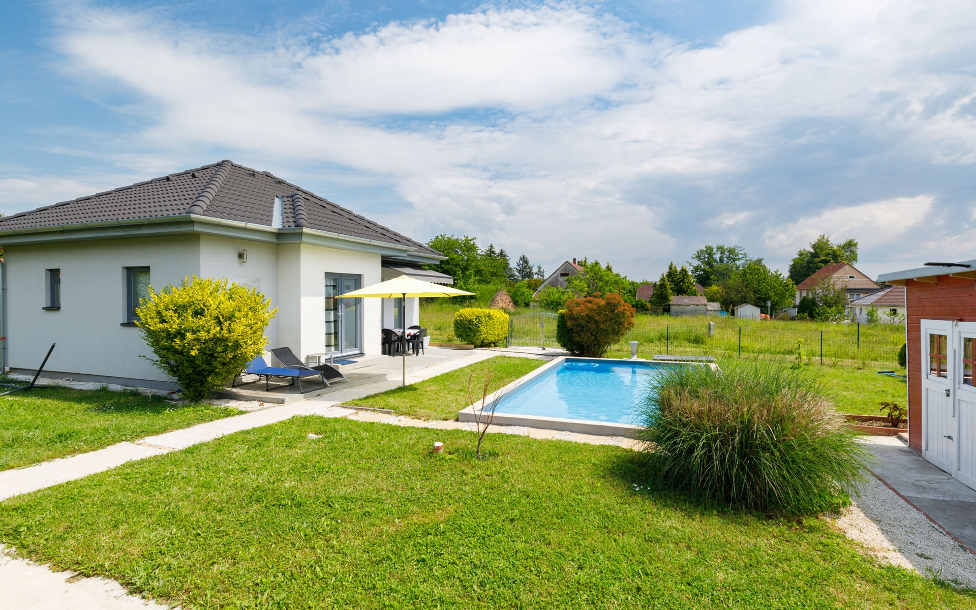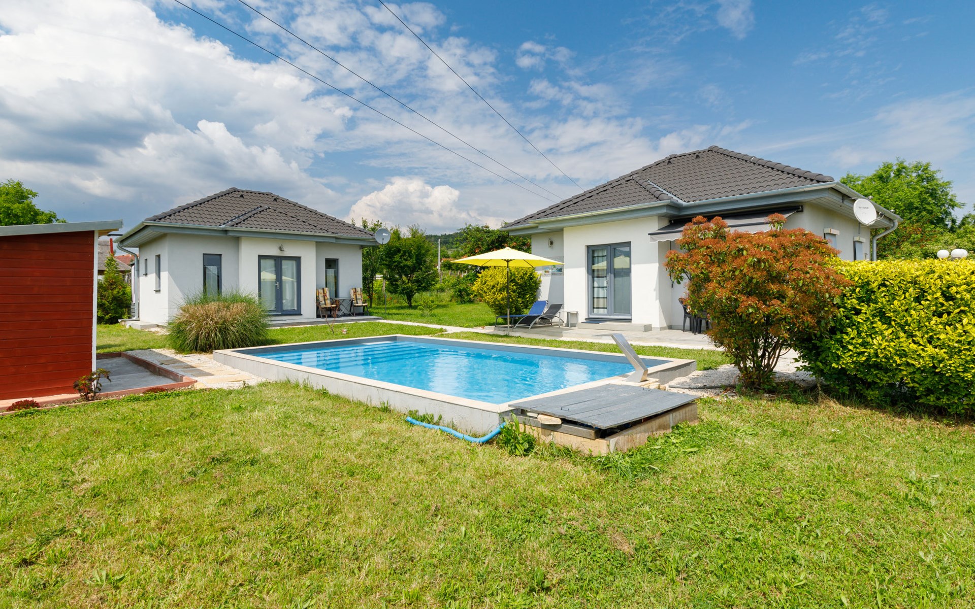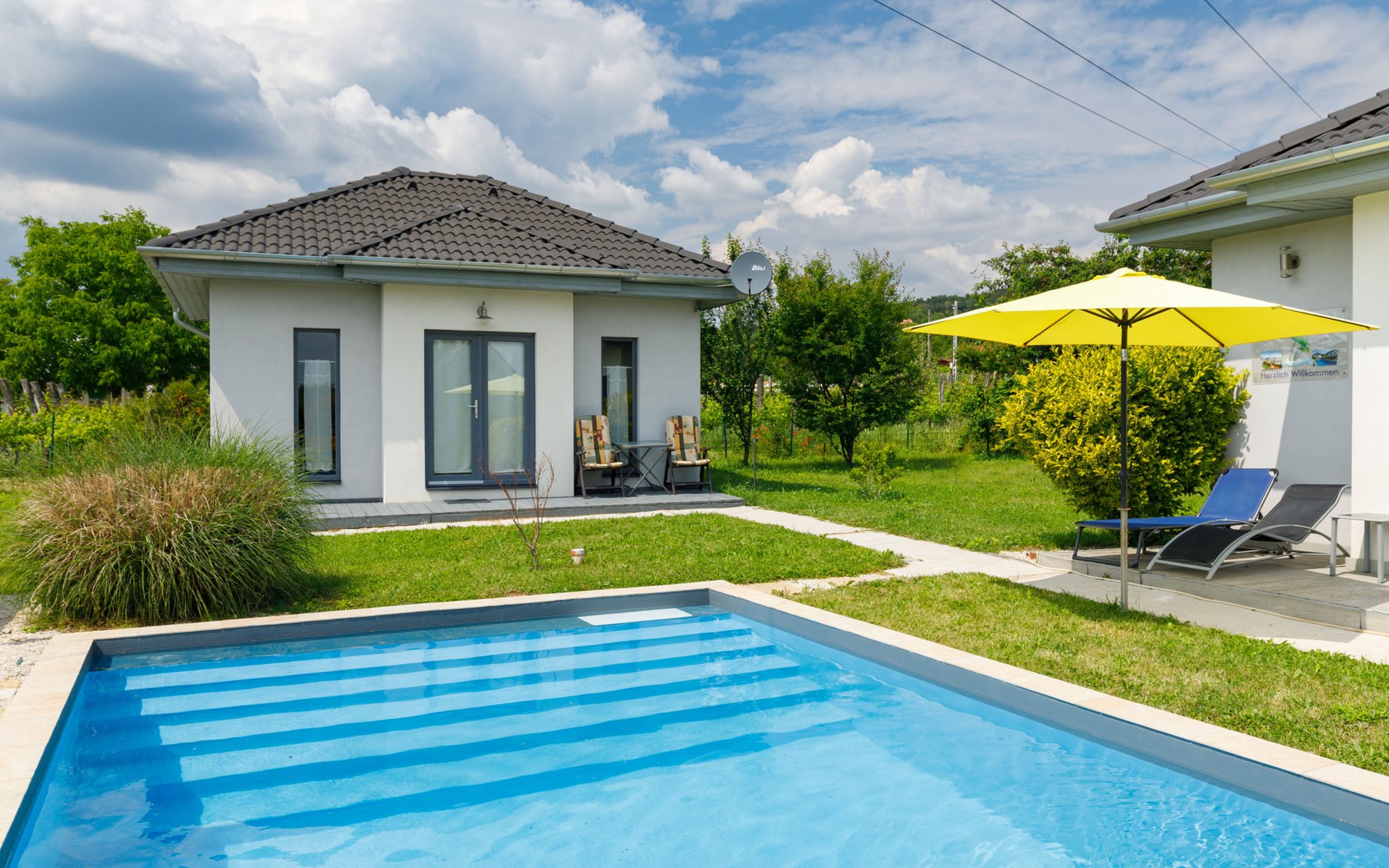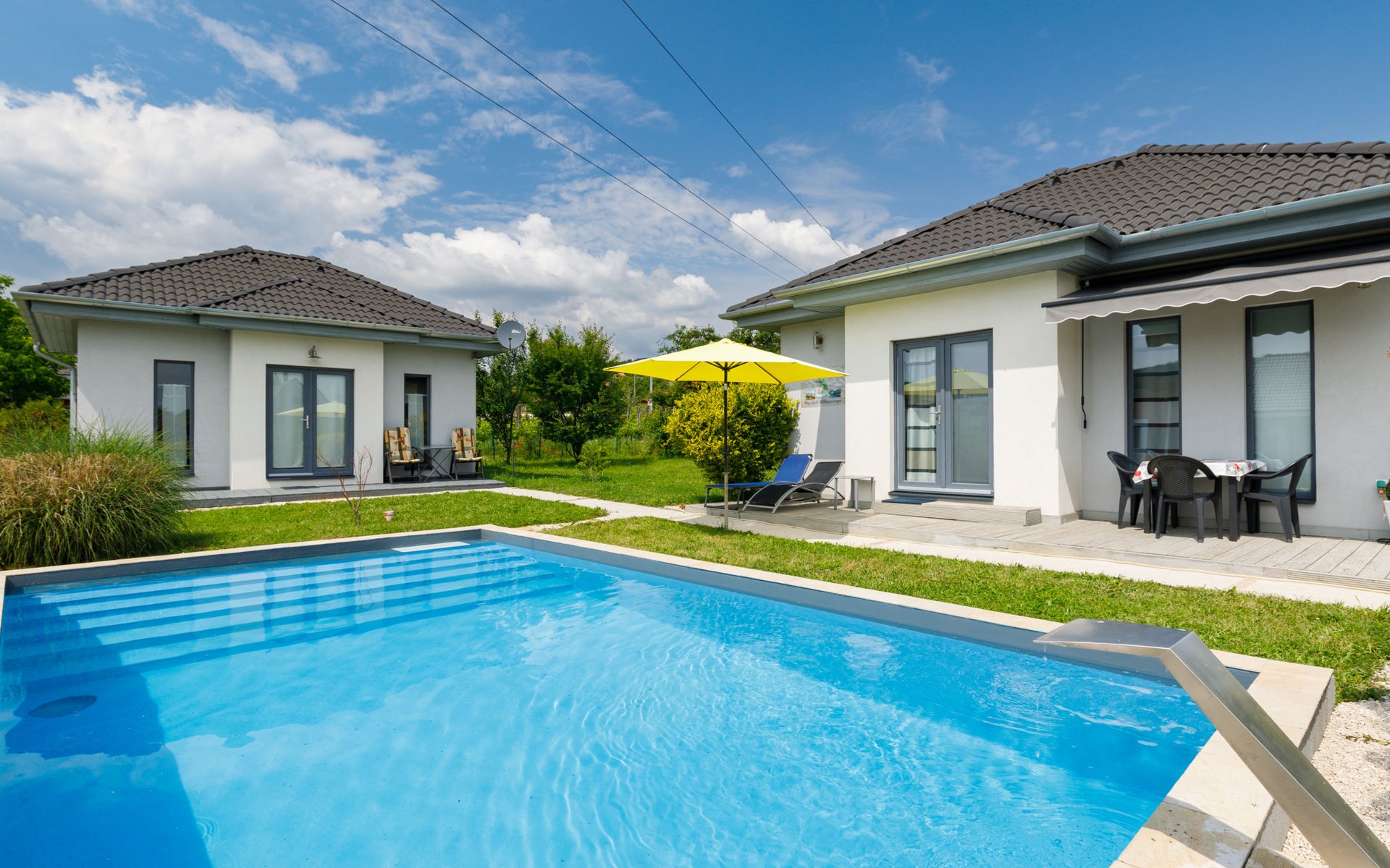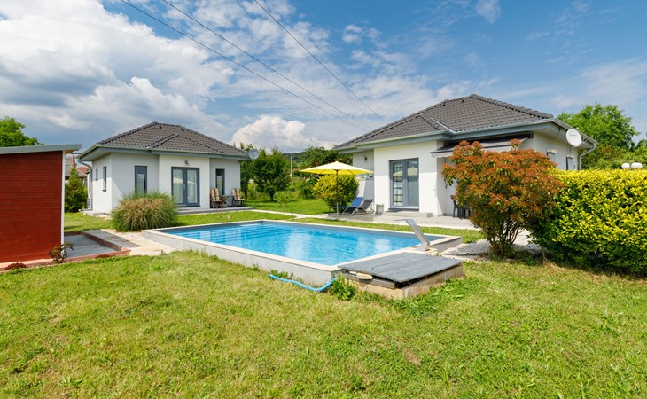 Ábrahámhegy 33 km van Keszthely: Mooi, comfortabel Huis met 2 woningen "Geminis", bouwjaar 2021. In de plaats, rustige ligging, 800 m van het meer, 1 km van het strand. Voor alleengebruik: terrein 800 m2 (omheind), tuin, ligweide, openluchtzwembad hoekig (4 x 7 m, 130 - 140 cm diepte, seizoensgebonden beschikbaarheid: 20.Mei. - 03.Okt.). In het huis: wasmachine. Beschikbaar: fietsen (2). Levensmiddelenwinkel 500 m, restaurant 600 m, grasstrand 800 m.