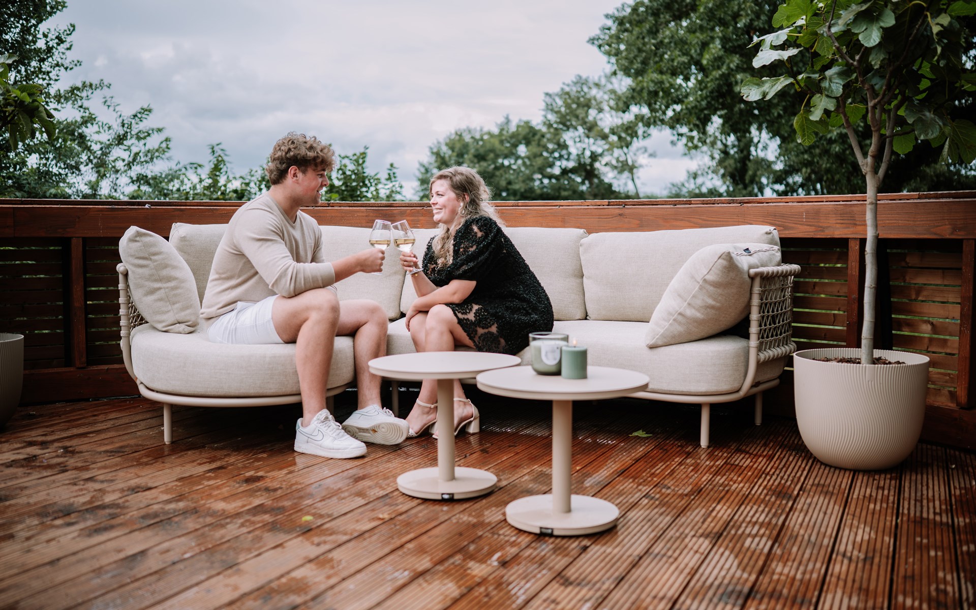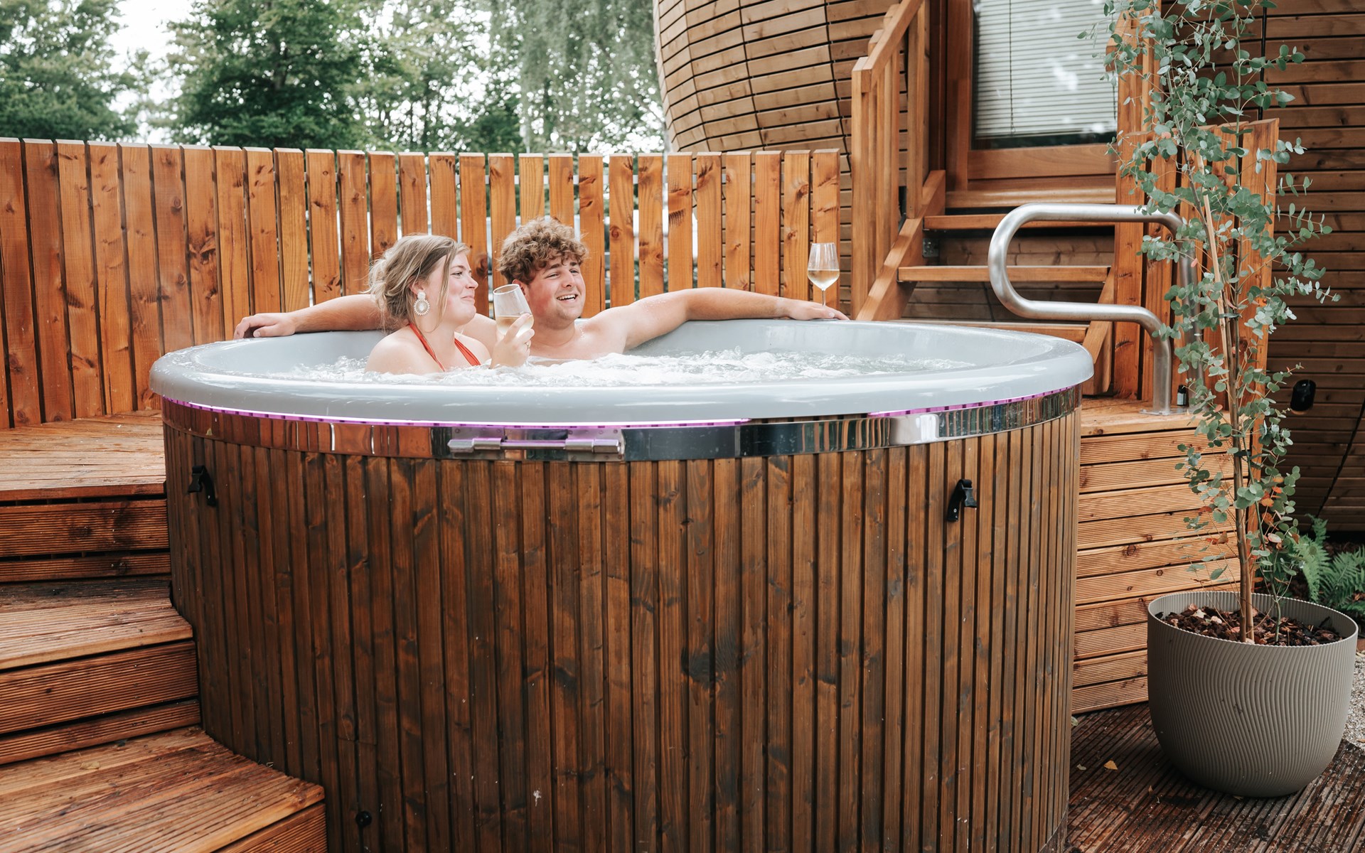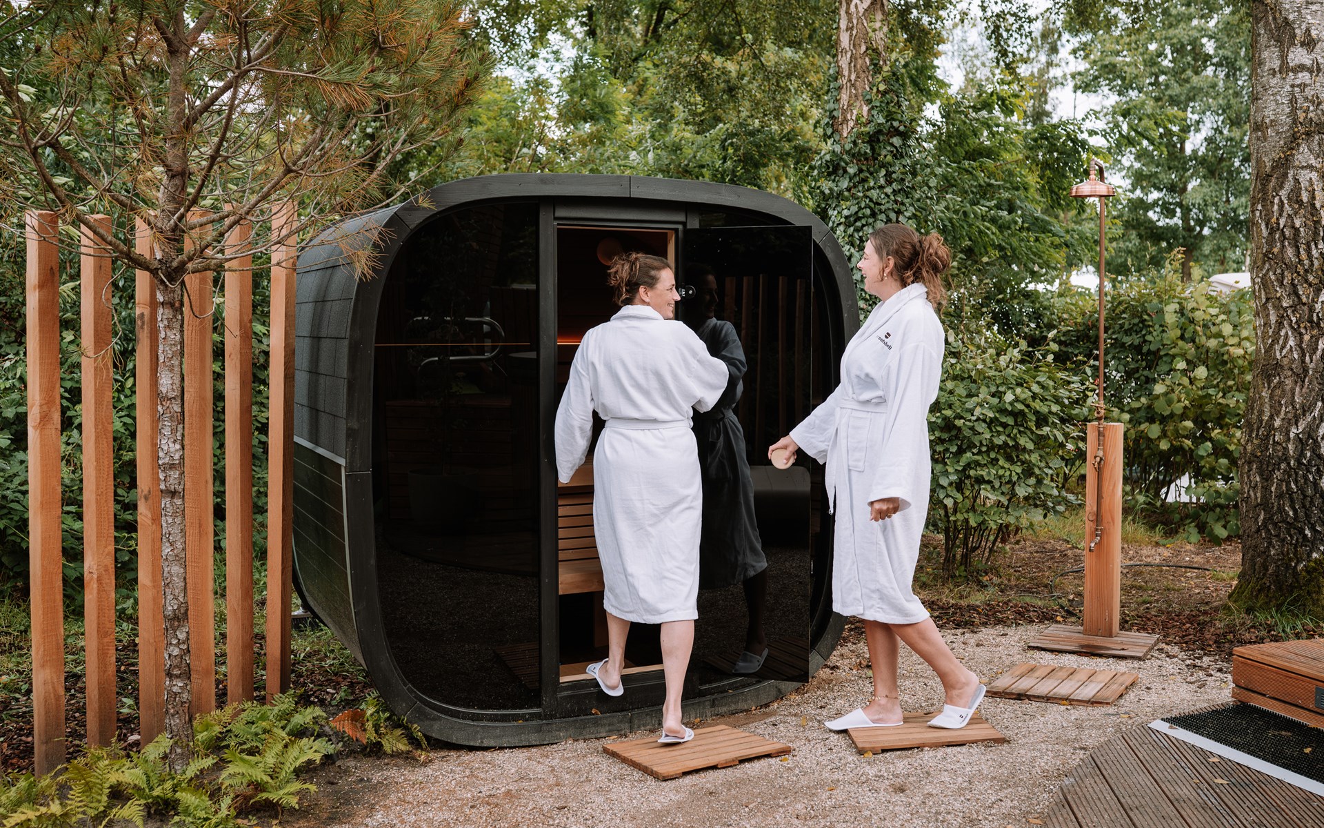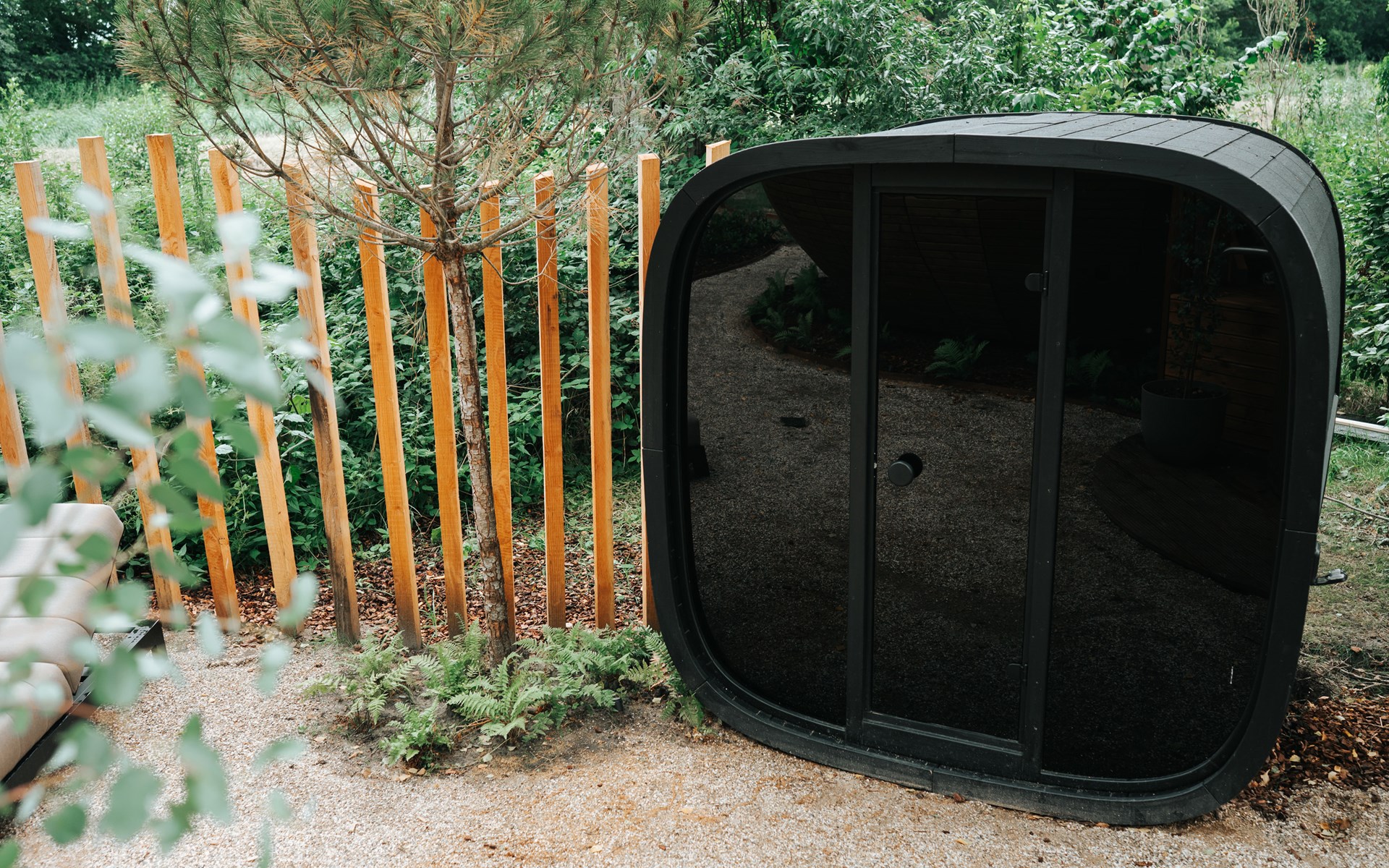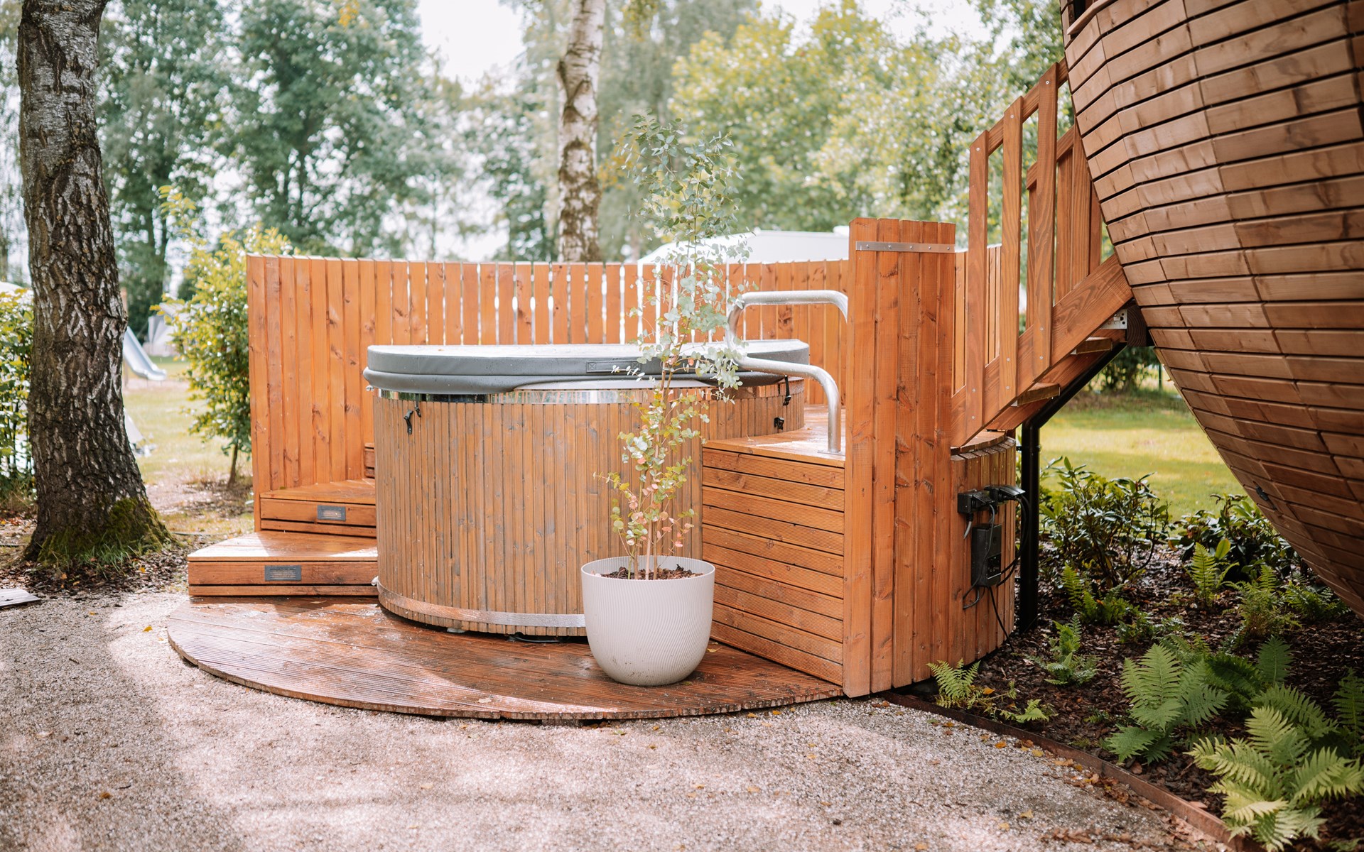Naast de accommodatie vind je een luxe privé sauna die los staat en omringd wordt door groen. Deze sauna biedt volledige privacy en is de ideale plek om je lichaam en geest te laten ontspannen. Of je nu alleen even tot rust wilt komen of samen wilt genieten, de sauna voegt een extra dimensie van luxe en comfort toe aan je verblijf.