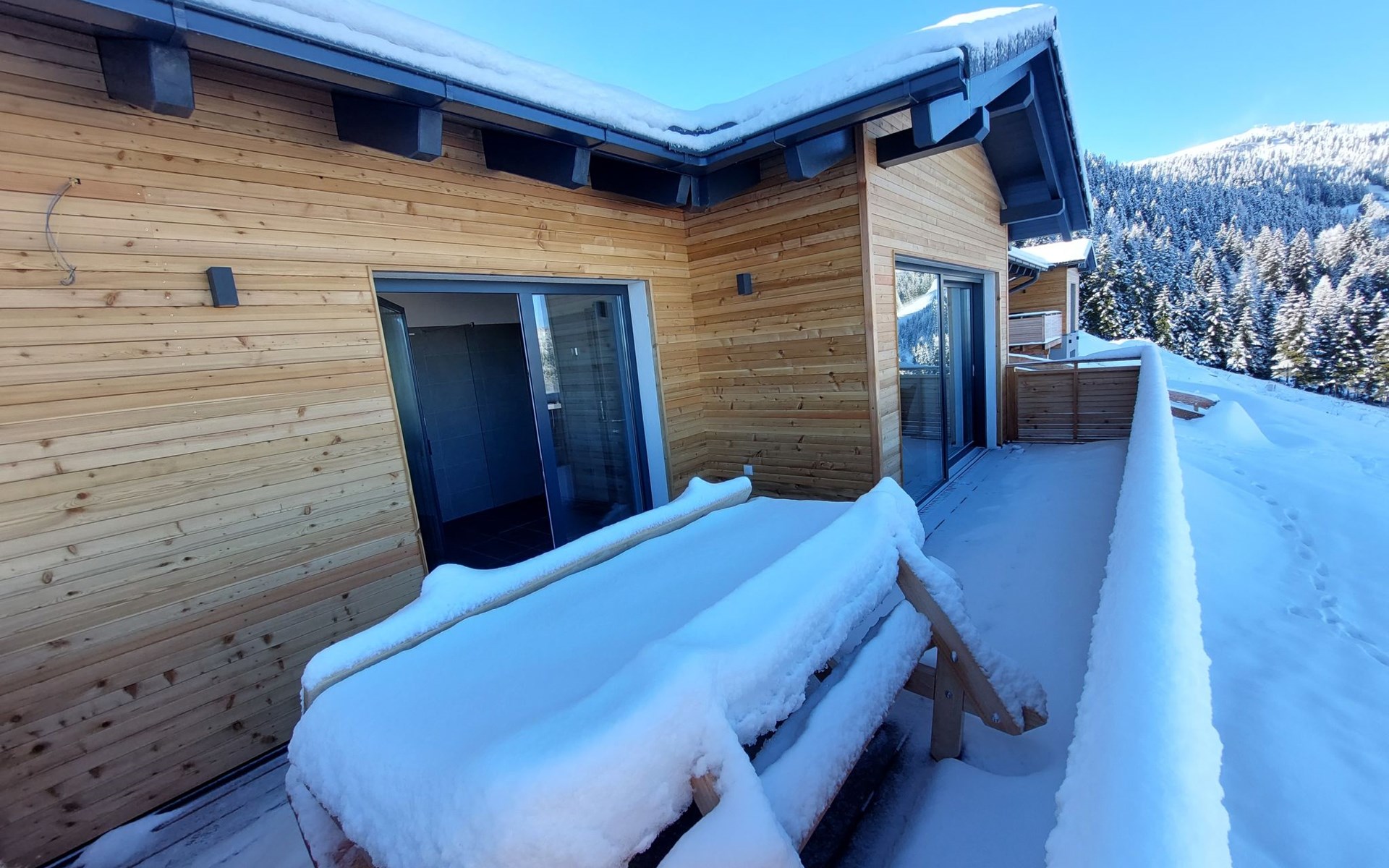 Zeer moderne chalet "Diamondsky", 1.600 m boven zeeniveau, vrijstaand, bouwjaar 2022, omgeven door weiden. In de wijk Kliening, rustige, zonnige ligging tegen een helling, 400 m van het skigebied, aan een doodlopende weg. Voor alleengebruik: wild terrein. In het huis: met TV, Internet (WiFi), hot tub, centrale verwarming, wasmachine, droger. Rommelige toegangsweg tot het terrein (onverharde weg). In de winter sneeuwkettingen aanbevolen. Trappenweg (30 treden) naar het huis. Parkeerplaats (voor 2 auto's). Levensmiddelenwinkel 15 km, restaurant 1 km, bushalte "Bad St. Leonhard Moosweg (West)" 15.2 km, meer Längssee 35 km. Wandelroutes 5 m vanaf het huis, stoeltjeslift 450 m, skipisten, skiverhuur 200 m. Attracties in de buurt: Sommerrodelbahn Klippitztörl 2 km, Klettergarten 2 km. Bekende meren kunnen gemakkelijk worden bereikt: Längssee 35 km, Klopeinersee 60 km. Wandelgebied Koralm, Saualm, Lavantaler Alpen. Auto noodzakelijk. Bij goede skicondities is het huis bereikbaar per ski. Zelfbedieningsautomaat voor voedsel en dagelijkse benodigdheden op 500m. Vanwege de geografische ligging op de berg kan internetontvangst niet continu worden gegarandeerd en is deze sterk afhankelijk van het weer.