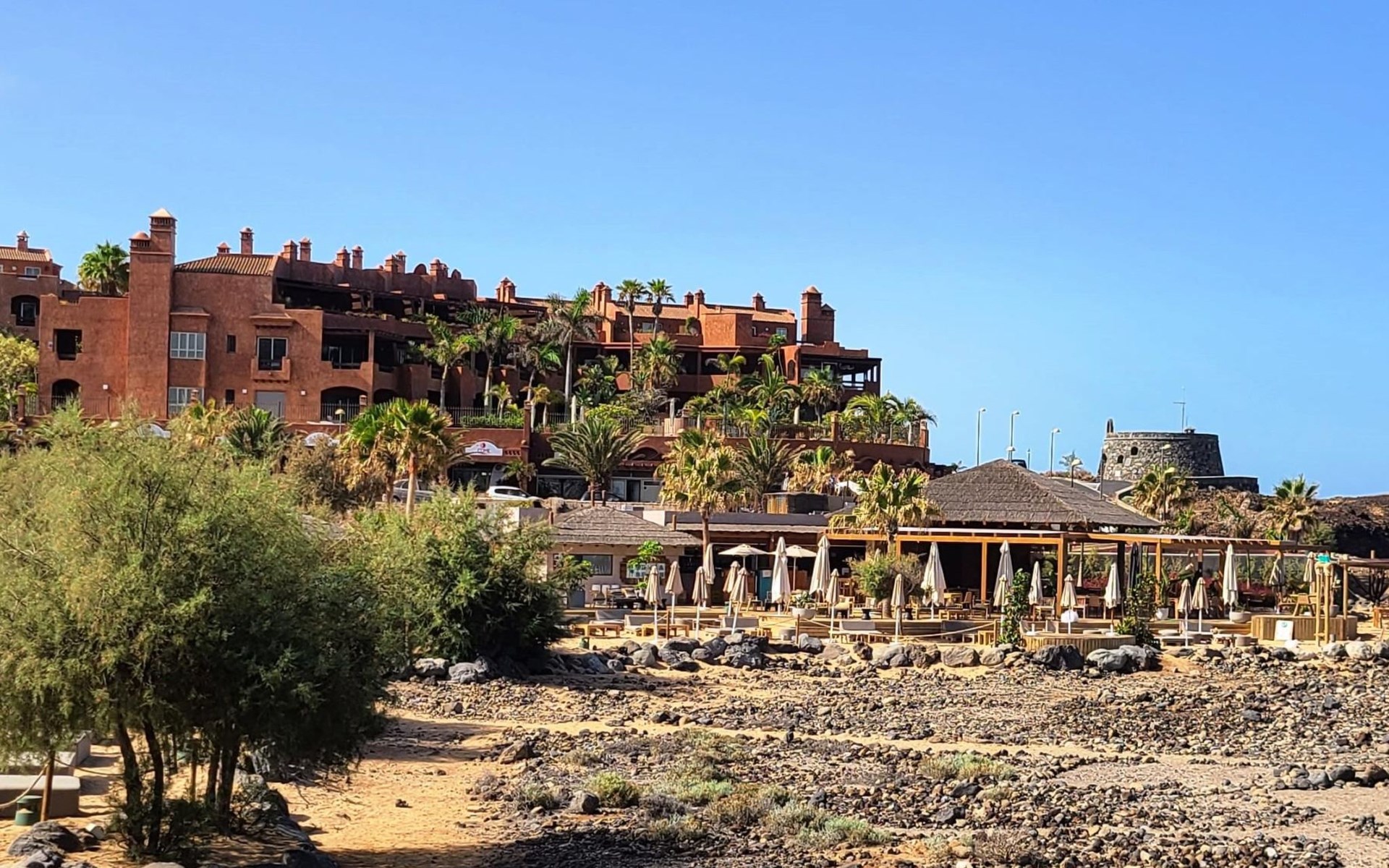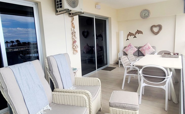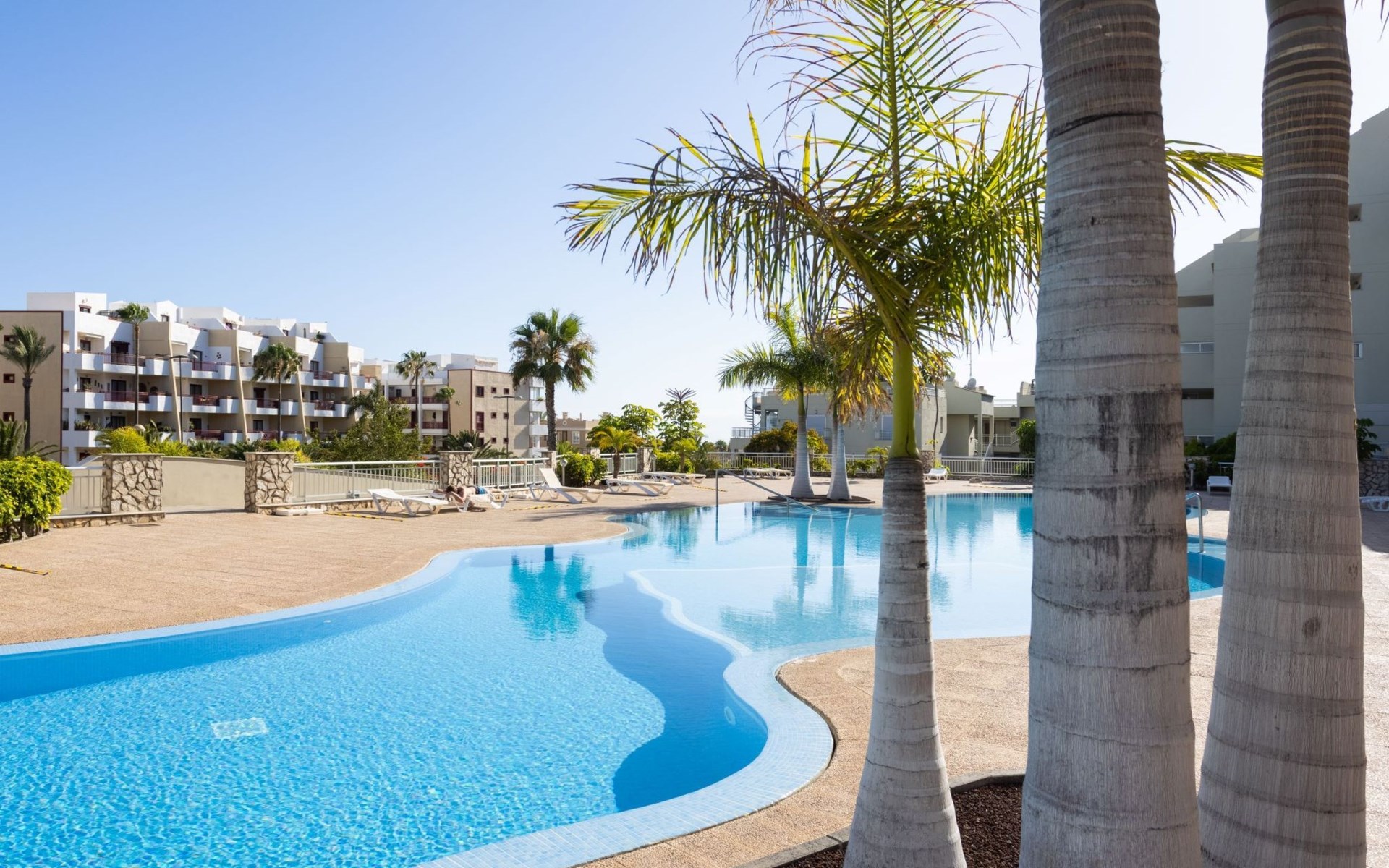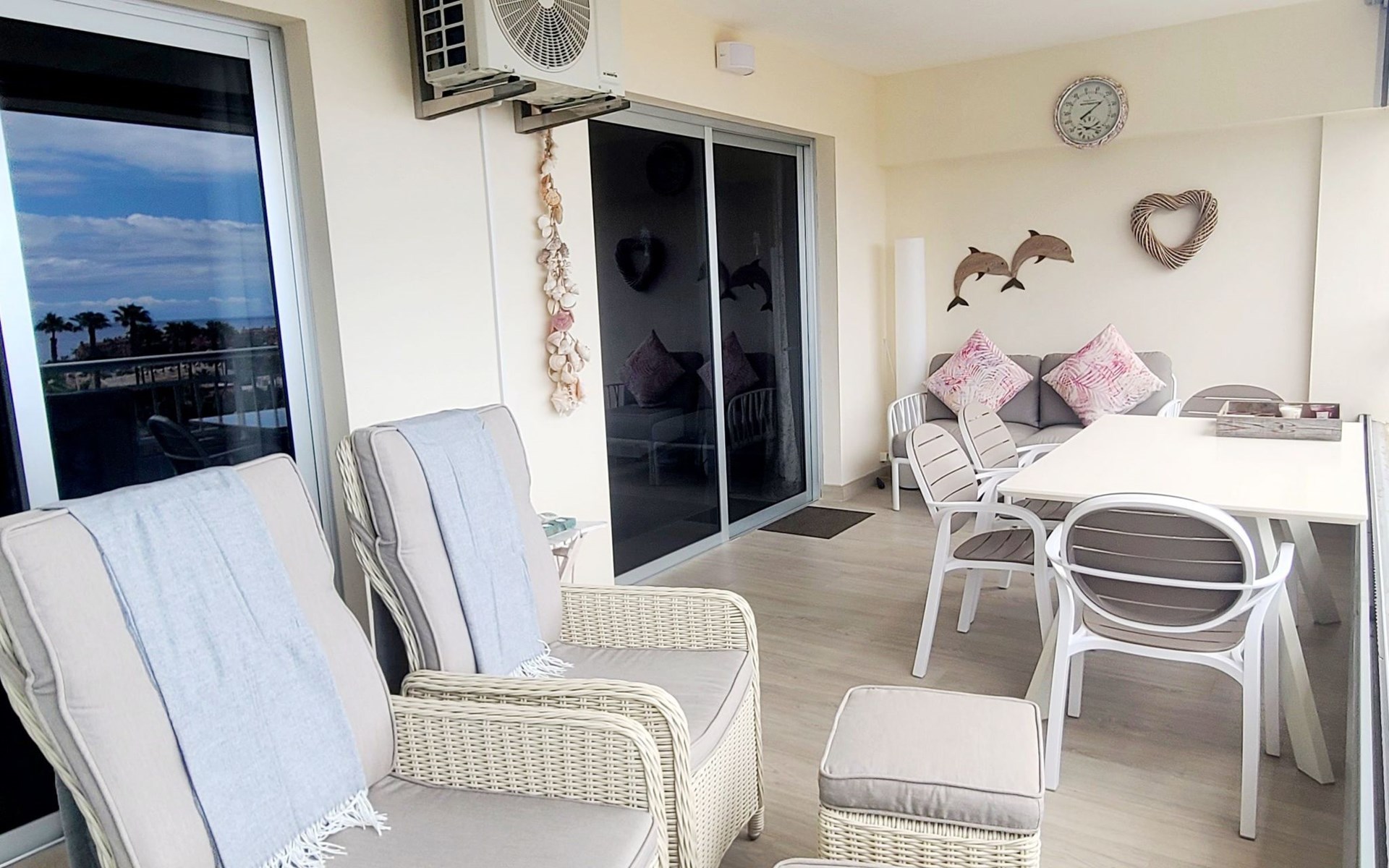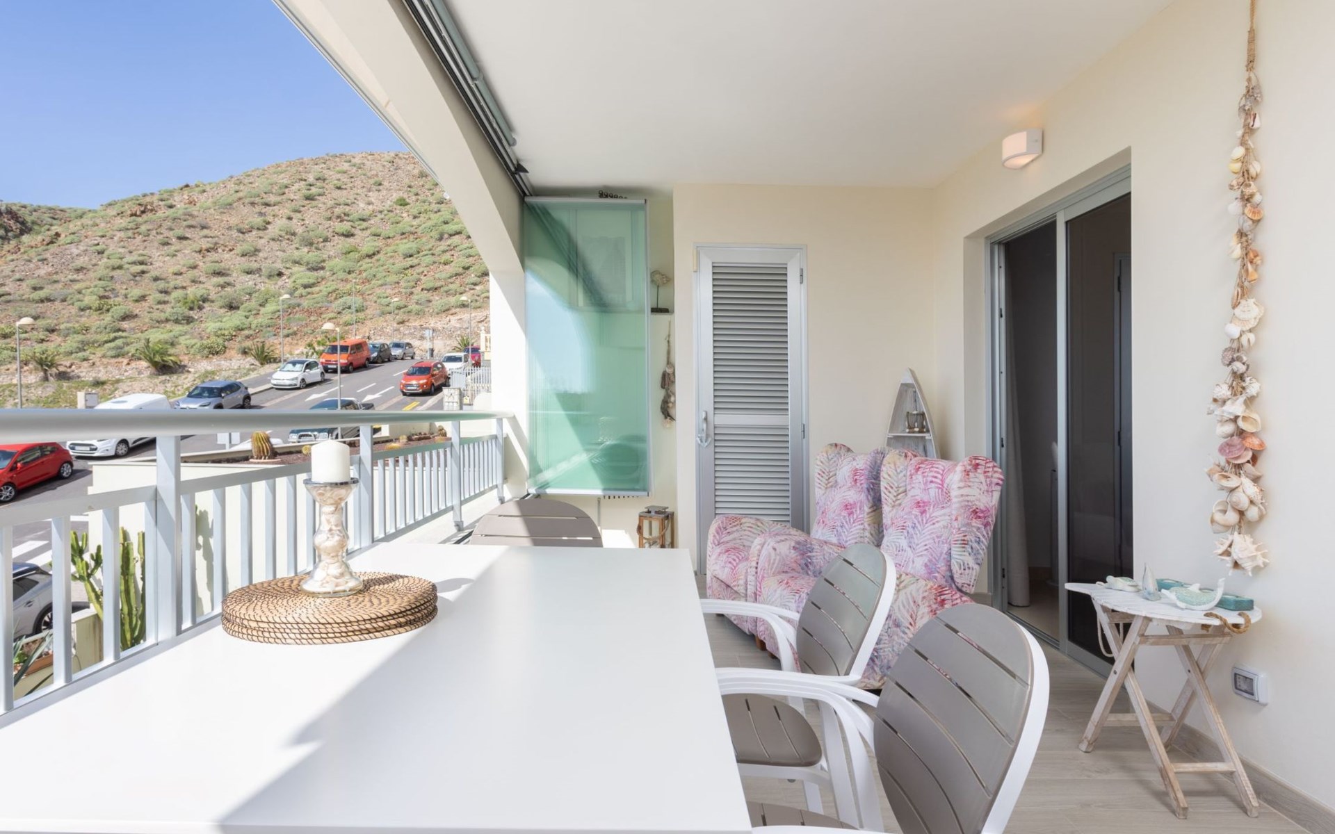 Palm Mar is a quiet, elegant and exclusive residential area in a privileged location between two nature reserves and the sea. Palm Mar is not marketed for tourism, so it is outside the mass tourism in an extremely quiet location and has no hotel or disco and hardly any traffic. An ideal place for holidaymakers who are looking for peace and relaxation, close to the sea and the beautiful beach promenade, from where they can watch the fantastic sunsets behind Isla Gomera. Palm Mar is only 10 minutes by car from the tourist areas of Los Cristianos, Las Americas and Costa Adeje. Tenerife Sur Reina Sofia Airport is 10 kilometres away. At only 50m from the apartment there is a supermarket, bars, restaurants, medical centre, bank, etc. The original beach with the long beach promenade is only 500 metres from the apartment.The flat is approx. 70sqm in size, the terrace with its 14sqm is the highlight of the entire flat. It has just been completely renovated by us with only high-quality materials and modern furniture, the bathroom and kitchen are also completely new. As soon as you wake up you have a great view of the sea directly from your bed, when you sit on the sofa in the lounge you can see the sea, it accompanies you throughout the flat, wherever you are, you can see the sea. The spacious terrace offers a comfortable dining area and a relaxation zone where you can enjoy the beautiful sunsets. The terrace can be used completely open but also protected from the wind and sun behind 6 metres of seamless glazing. The glazing can be opened comfortably and easily and disappears to the side, so that the terrace can be used in any weather.from the modern and very comfortable sofa bed in the salon you can watch your favourite programmes on the new 65" Smart TV, in the bedroom there is another 55" TV where you can watch sports etc. independently of the salon. The bedroom has air conditioning, for which there is a weekly charge.The terrace is modern and comfortably furnished, the two relaxing armchairs invite you to watch the sunset over the sea with a cocktail in your hand. At the large communal pool, we have purchased two private sun loungers with parasols especially for our guests, which are labelled with the flat number M15. The padel tennis court can be used at any time and free of charge. An underground parking space is available to our guests free of charge, lift available and wheelchair accessible.There is a bakery right on the avenue for your fresh bread rolls in the morning and there are other supermarkets for your daily needs and nice cafes, bars and restaurants of various nationalities within a short walking distance. You can walk to the beach promenade in 5 minutes, where the cosy beach bar "Chiringuito Palm Mar" and the elegant beach club "Bahia Beach" await you.Palm Mar is a quiet, elegant and exclusive residential area in a privileged location between two nature reserves and the sea. Palm Mar is not marketed for tourism, so it is outside the mass tourism in an extremely quiet location and has no hotel or disco and no traffic. An ideal place for holidaymakers who are looking for peace and relaxation, close to the sea and the beautiful beach promenade, from where they can watch the fantastic sunsets behind Isla Gomera. Palm Mar is only 10 minutes by car from the tourist areas of Los Cristianos, Las Americas and Costa Adeje. Tenerife Sur Reina Sofia Airport is 10 kilometres away. At only 50-100m from the apartment there is a supermarket, bars, restaurants, medical centre, bank, etc. The original beach with the long beach promenade is only 500 metres from the apartment. An exclusive beach club has just opened there and a very cosy chiringuito has also recently found its location there. From the bar, with a cocktail or a cold beer in your hand, you can watch the sea, Los Cristianos, the ferries arriving and departing and the sun setting behind La Gomera. The beautiful Malpais nature reserve of La Rasca (popular for hiking and trekking) is a 10-minute walk along the seafront promenade. Here you walk through a colourful volcanic landscape along the sea, which is rewarded with the climb to the lighthouse after approx. 3 km. The nearest golf course is Los Palos, only 2 km away, Golf del Sur can be reached in about 10 minutes by car or the luxury golf course Costa Adeje is 20 minutes away, from the south airport it is about 20 minutes by car to Palm Mar. You can park your hire car either on the street directly in front of the building or in your own underground car park. ESFCTU0000380160007192340000000000000VV-38-4-0095