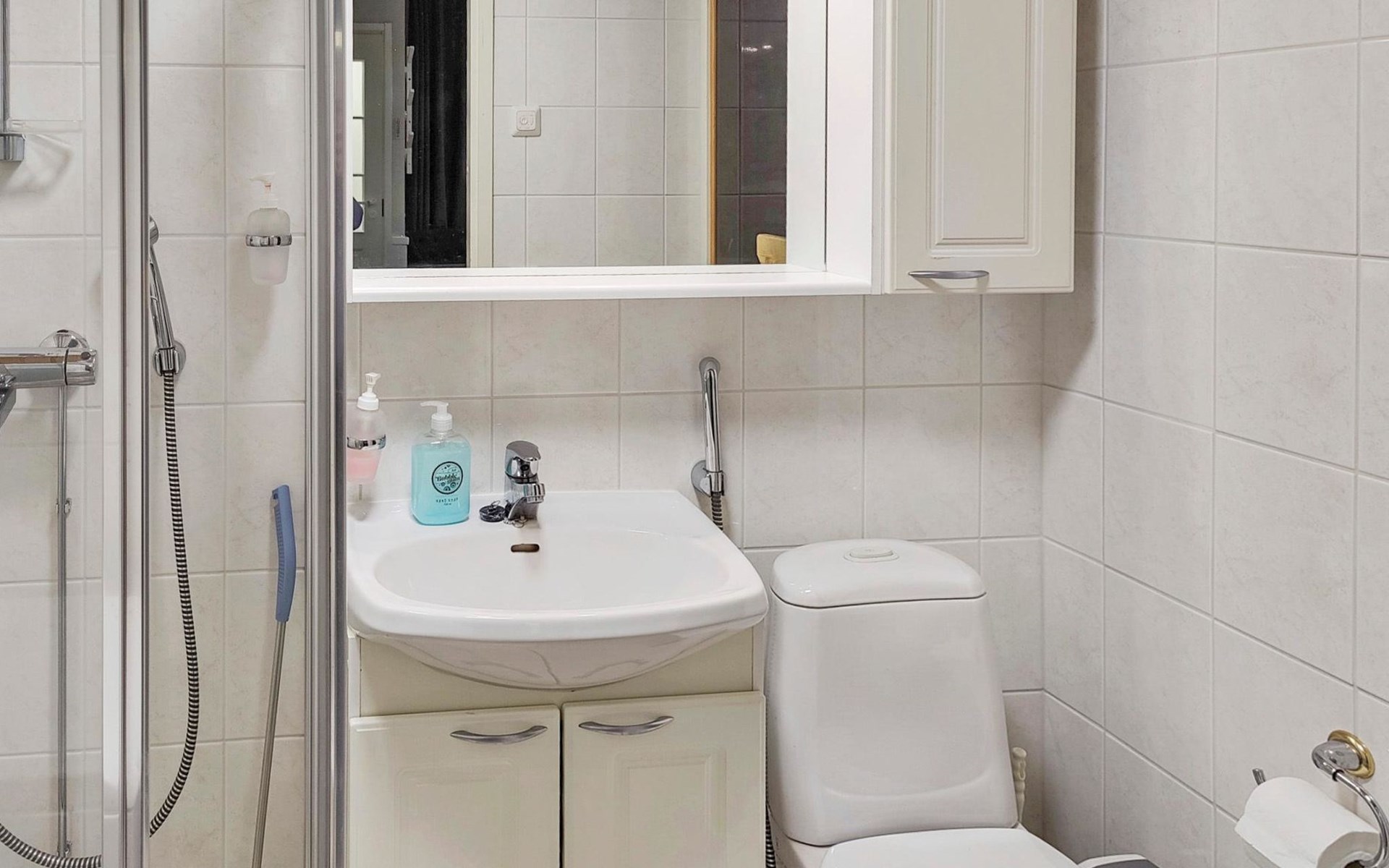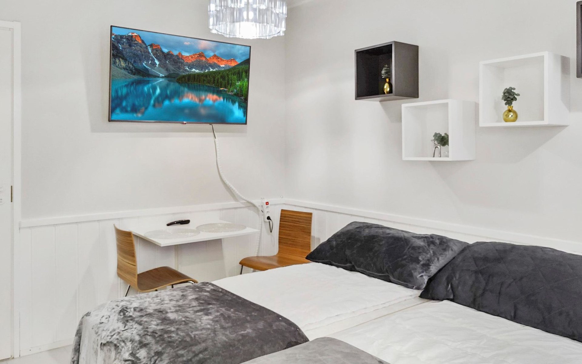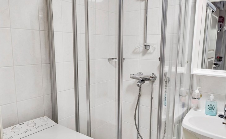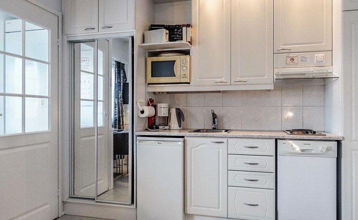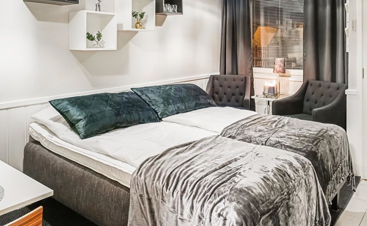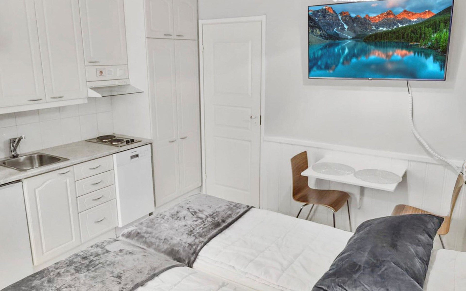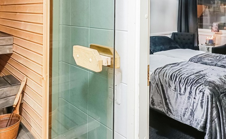 Studio apartment with sauna in a wood and stone-apartmenthotel on the second floor, built in 2003 (beds, microwave, tv and fridge refurbished in December -21), kitchen-living room with 2 beds, sauna (electric stove), bathroom. Wi-Fi. No fireplace.