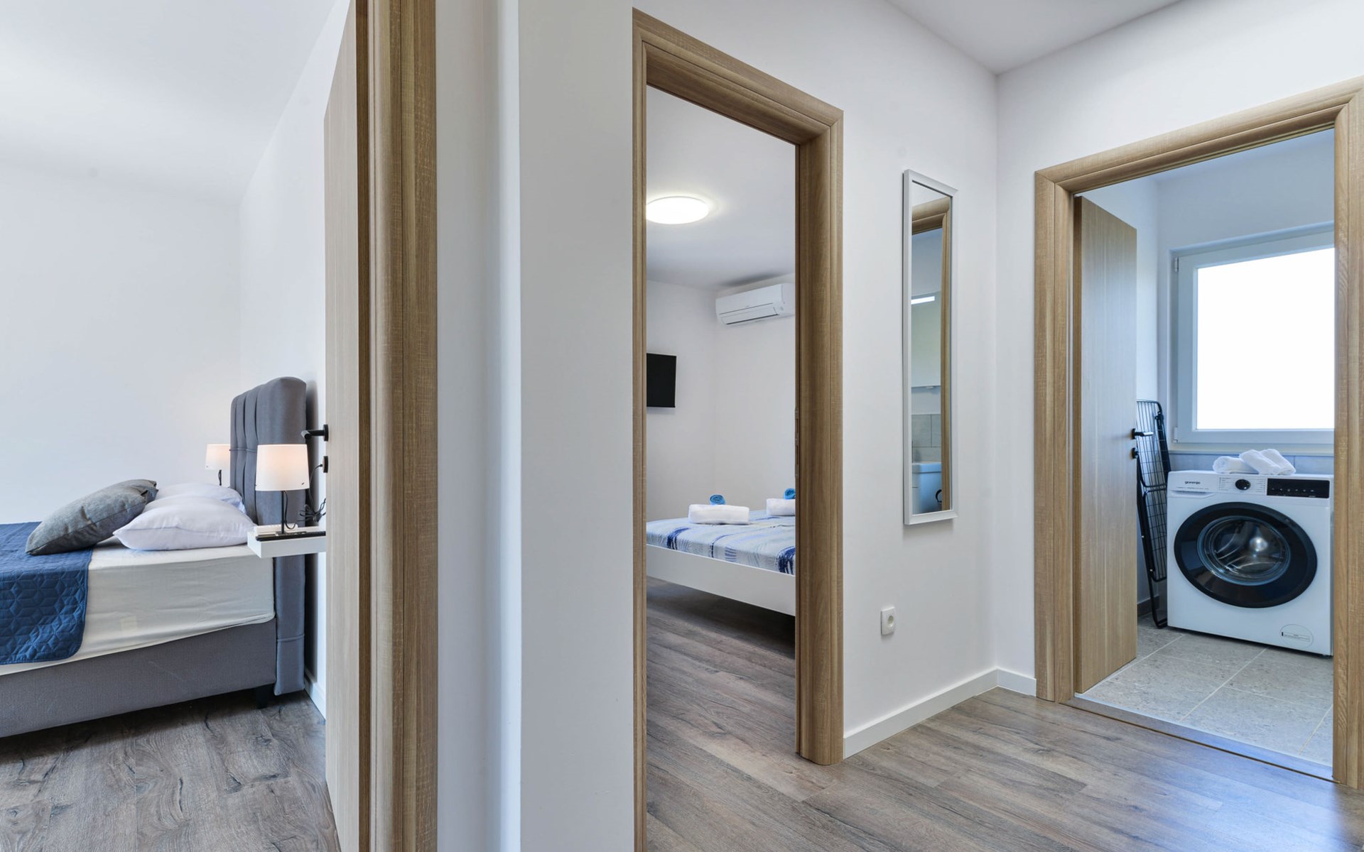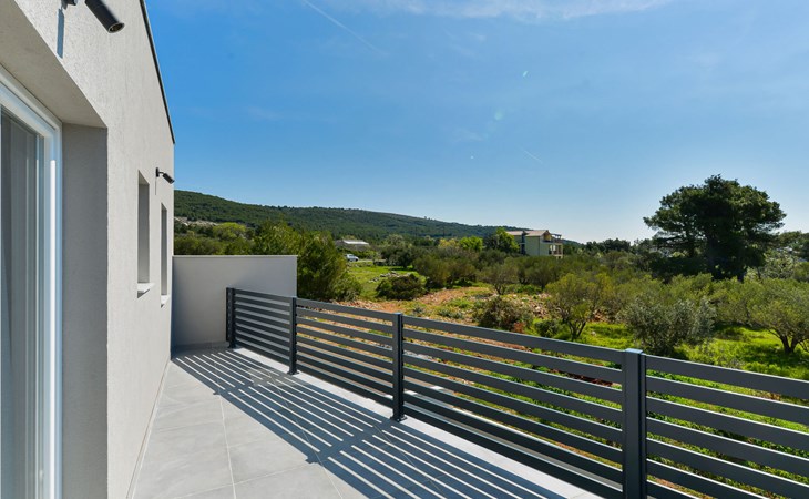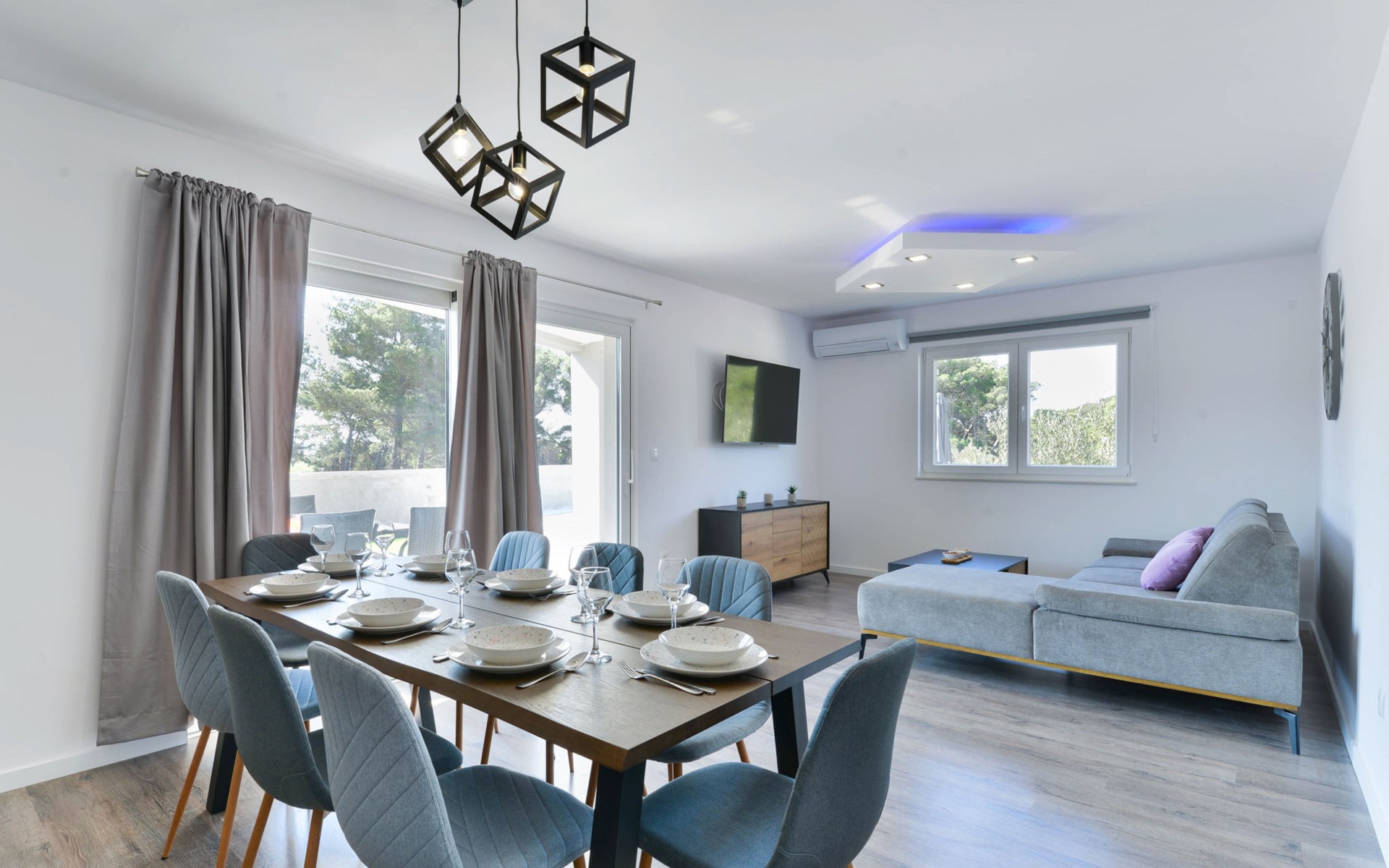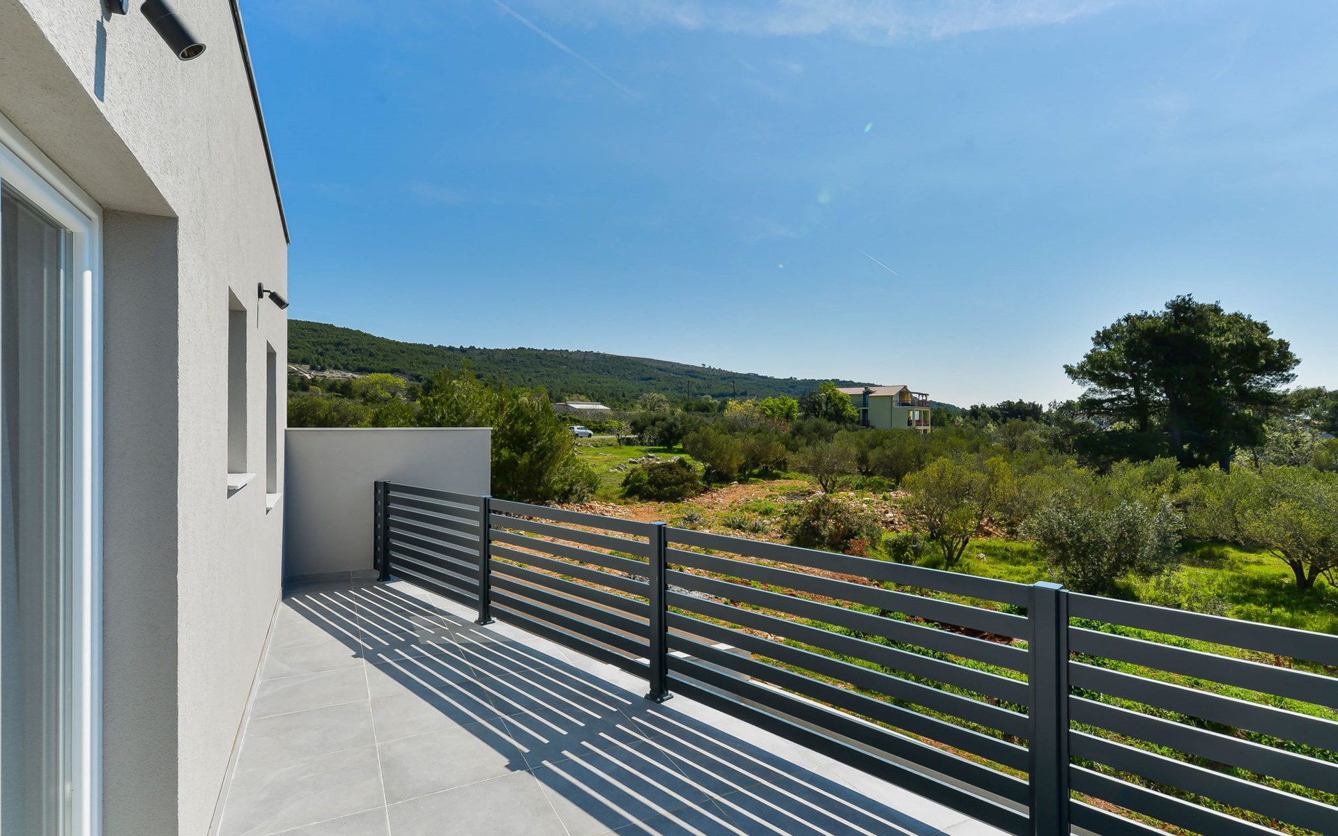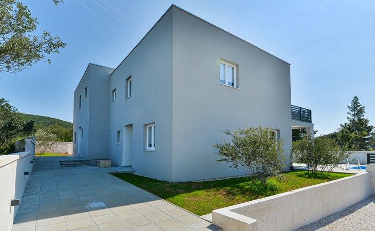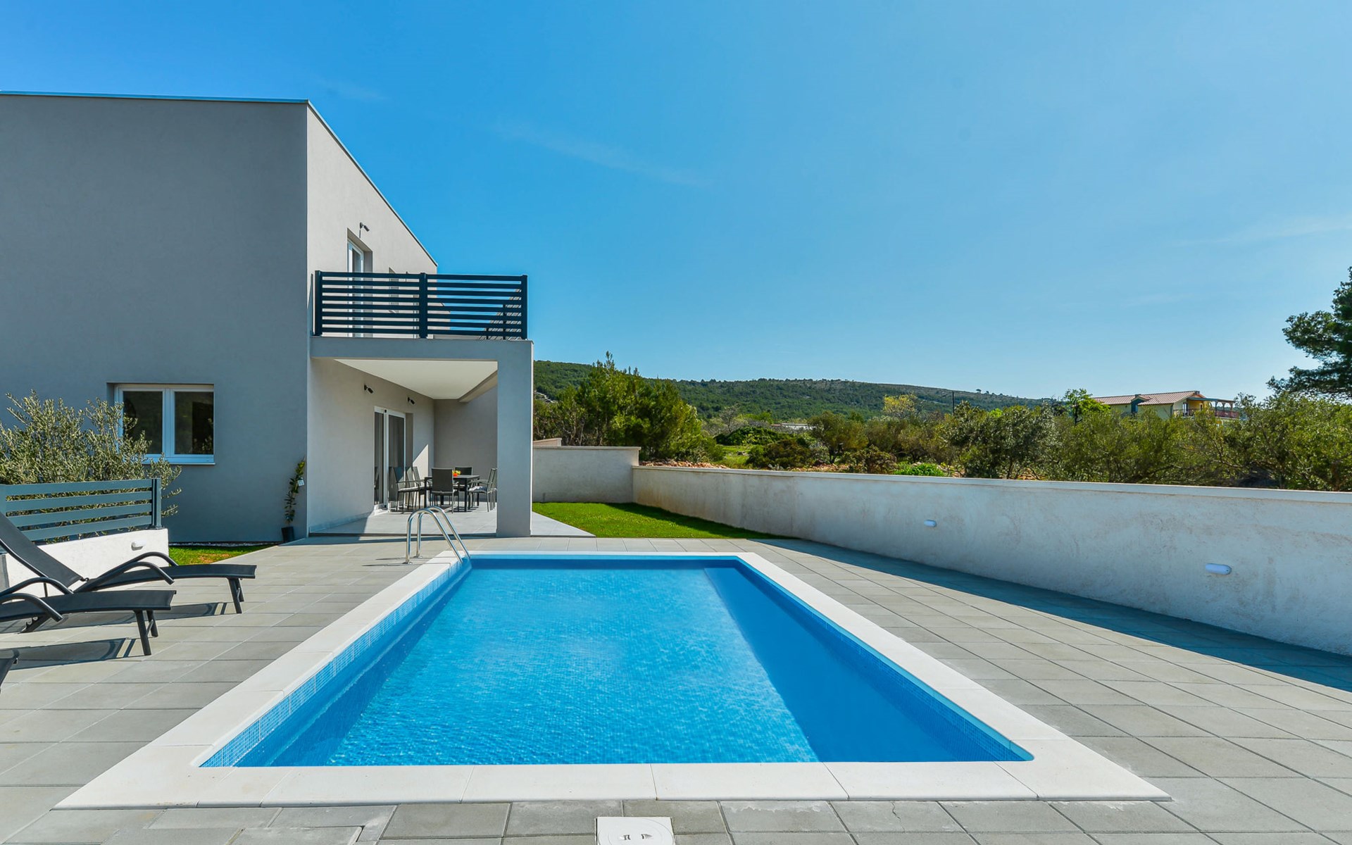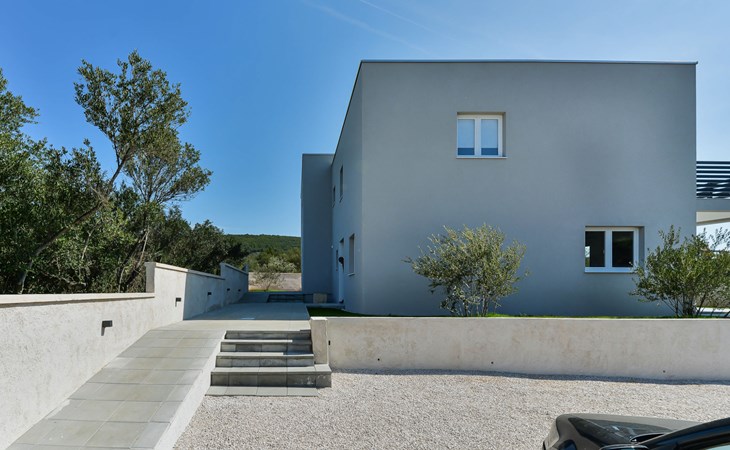 Tribunj 5 km van Vodice: Moderne, mooi twee onder één kap woning "Gušt", van 2 verdiepingen, bouwjaar 2023. In het gehucht Sovlje, 1.5 km van het centrum van Tribunj, rustige, zonnige ligging, 400 m van zee, 500 m van het strand. Voor alleengebruik: terrein 350 m2, openluchtzwembad hoekig, verwarmd (6 x 3 m, 21 m2, 150 cm diepte, seizoensgebonden beschikbaarheid: 01.Mei. - 31.Okt.). Buitendouche, barbecue, onderhoud zwembad door de eigenaar/tuinman. In het huis: internetaansluiting, wasmachine. Parkeerplaats (voor 2 auto's) bij het huis op het terrein. Winkel 1.5 km, restaurant 350 m, bushalte 5.2 km, kiezelstrand, betonnen strand 500 m.