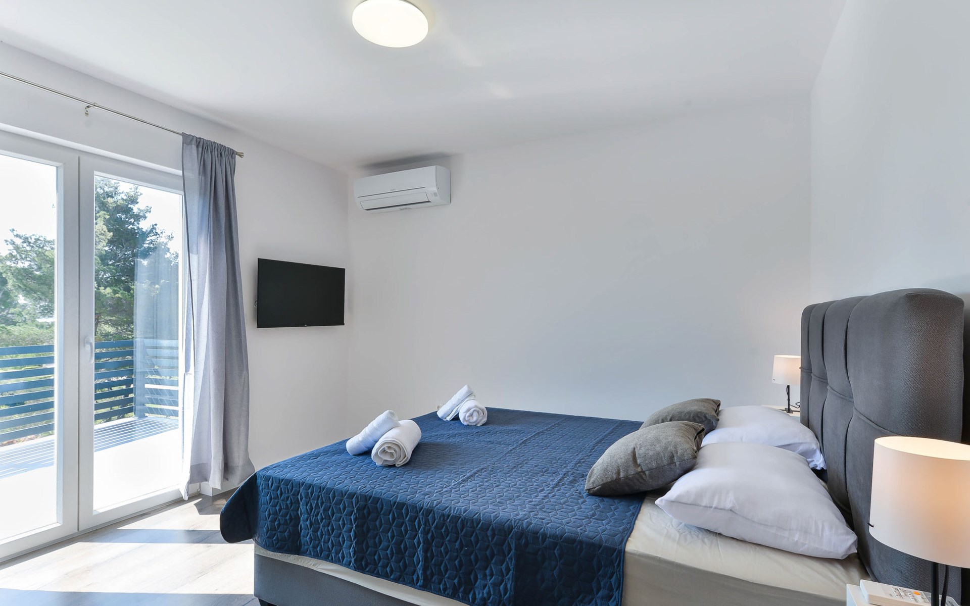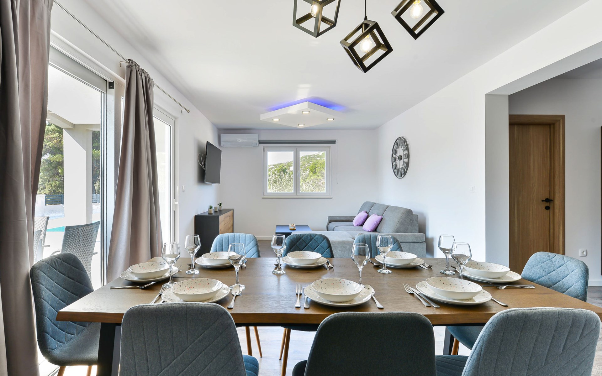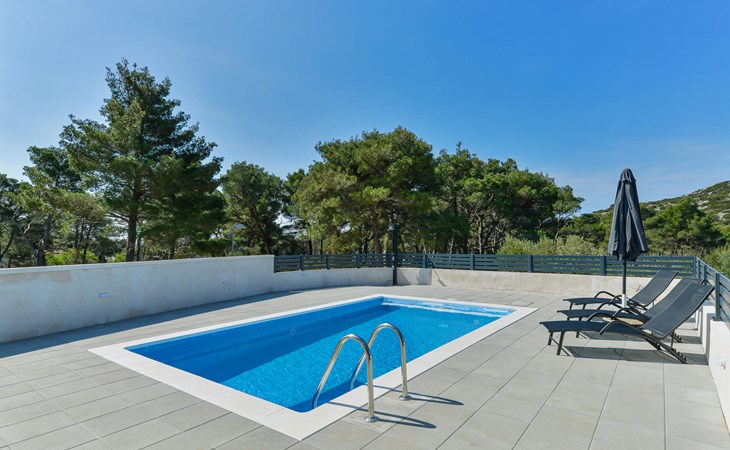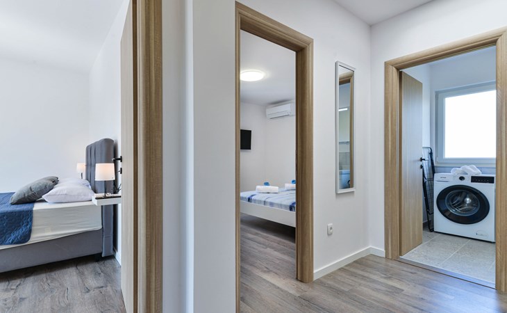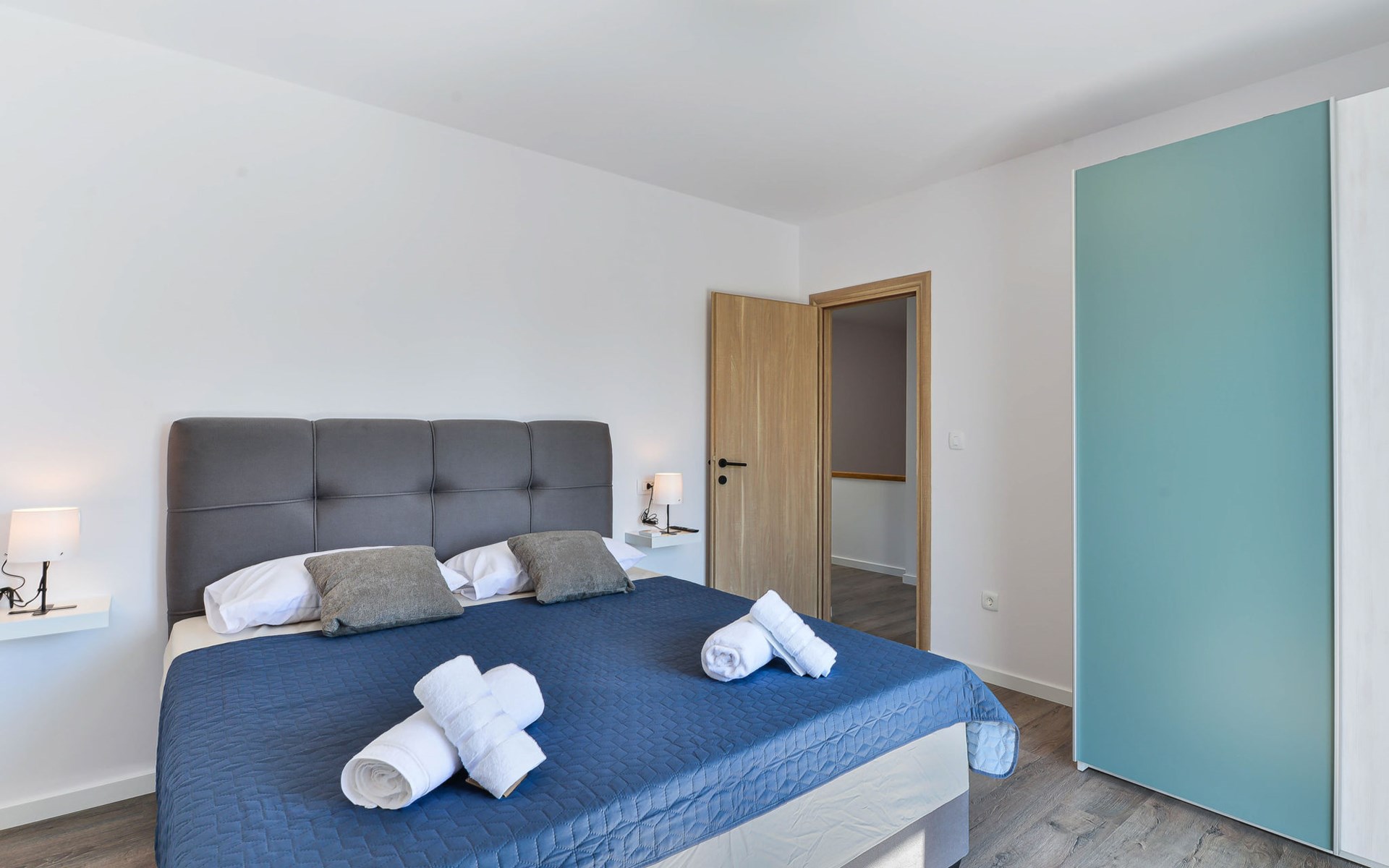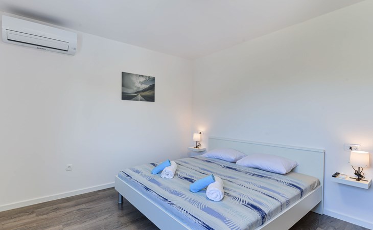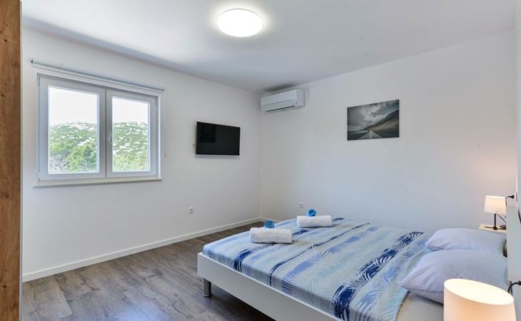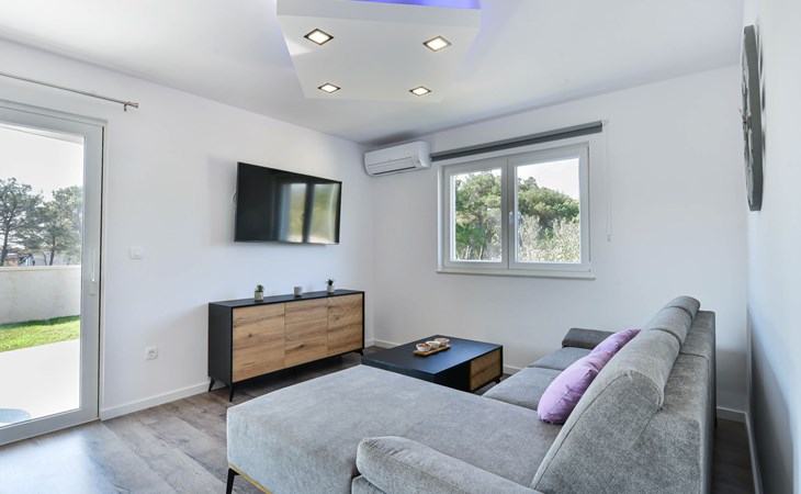 Tribunj 5 km van Vodice: Moderne, mooi twee onder één kap woning "Gušt", van 2 verdiepingen, bouwjaar 2023. In het gehucht Sovlje, 1.5 km van het centrum van Tribunj, rustige, zonnige ligging, 400 m van zee, 500 m van het strand. Voor alleengebruik: terrein 350 m2, openluchtzwembad hoekig, verwarmd (6 x 3 m, 21 m2, 150 cm diepte, seizoensgebonden beschikbaarheid: 01.Mei. - 31.Okt.). Buitendouche, barbecue, onderhoud zwembad door de eigenaar/tuinman. In het huis: internetaansluiting, wasmachine. Parkeerplaats (voor 2 auto's) bij het huis op het terrein. Winkel 1.5 km, restaurant 350 m, bushalte 5.2 km, kiezelstrand, betonnen strand 500 m.