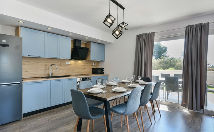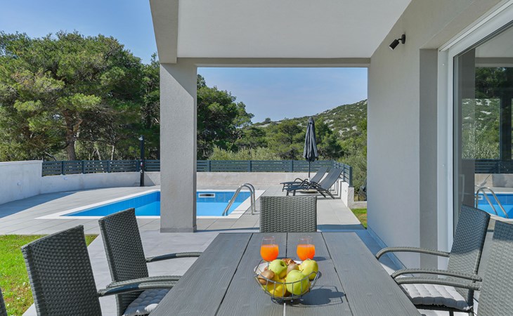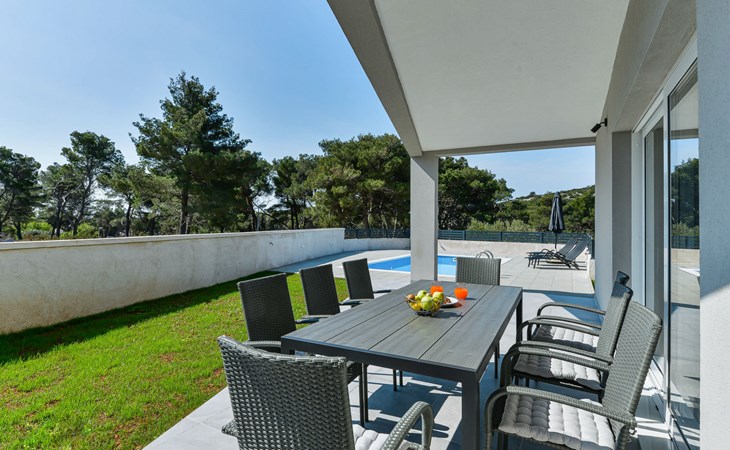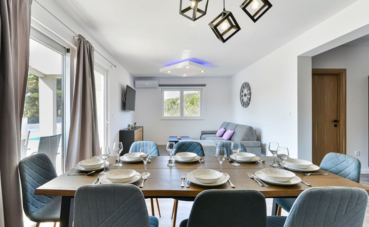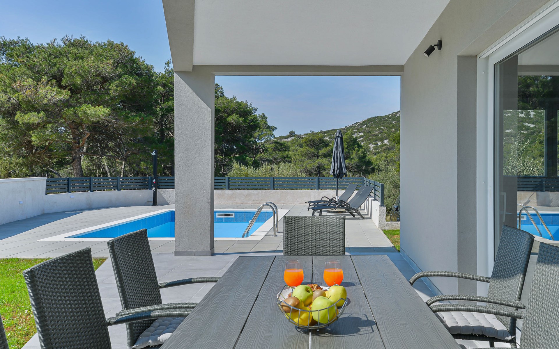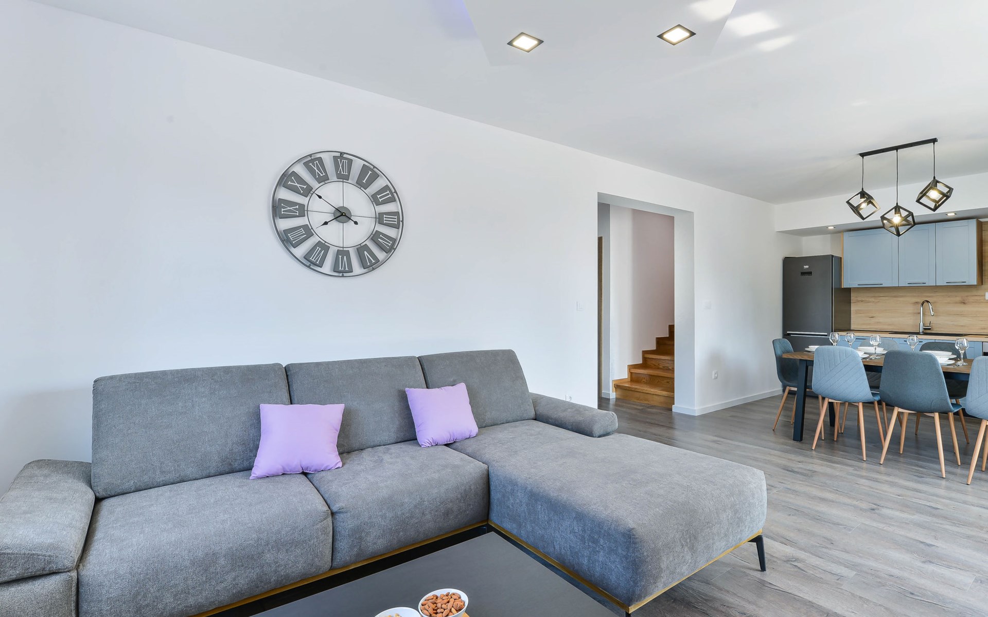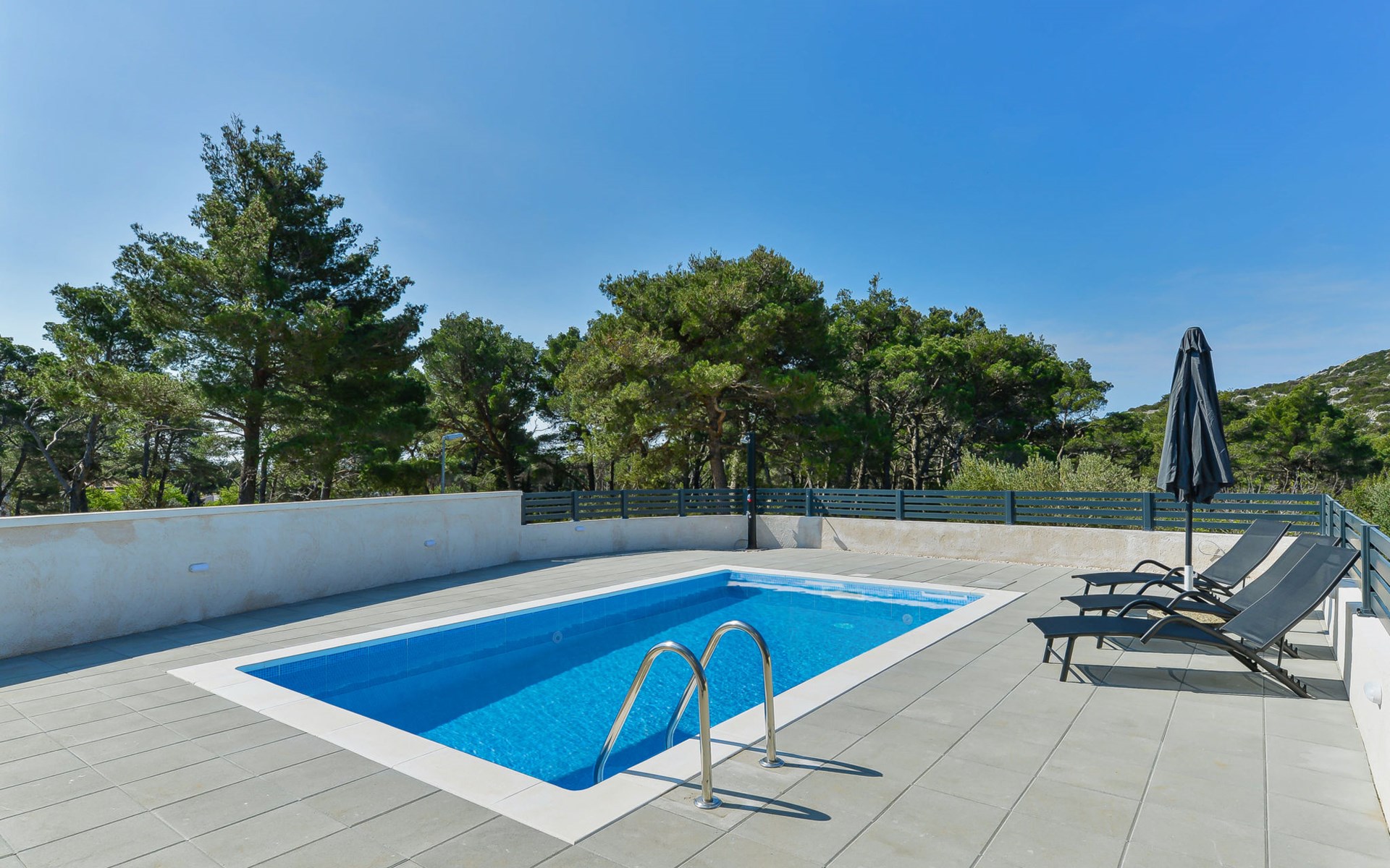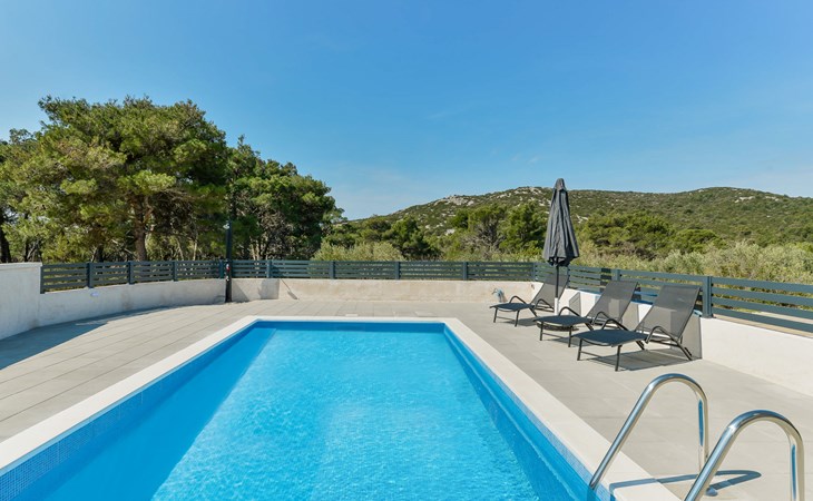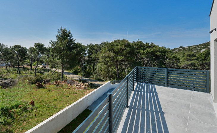 Tribunj 5 km van Vodice: Moderne, mooi twee onder één kap woning "Gušt", van 2 verdiepingen, bouwjaar 2023. In het gehucht Sovlje, 1.5 km van het centrum van Tribunj, rustige, zonnige ligging, 400 m van zee, 500 m van het strand. Voor alleengebruik: terrein 350 m2, openluchtzwembad hoekig, verwarmd (6 x 3 m, 21 m2, 150 cm diepte, seizoensgebonden beschikbaarheid: 01.Mei. - 31.Okt.). Buitendouche, barbecue, onderhoud zwembad door de eigenaar/tuinman. In het huis: internetaansluiting, wasmachine. Parkeerplaats (voor 2 auto's) bij het huis op het terrein. Winkel 1.5 km, restaurant 350 m, bushalte 5.2 km, kiezelstrand, betonnen strand 500 m.