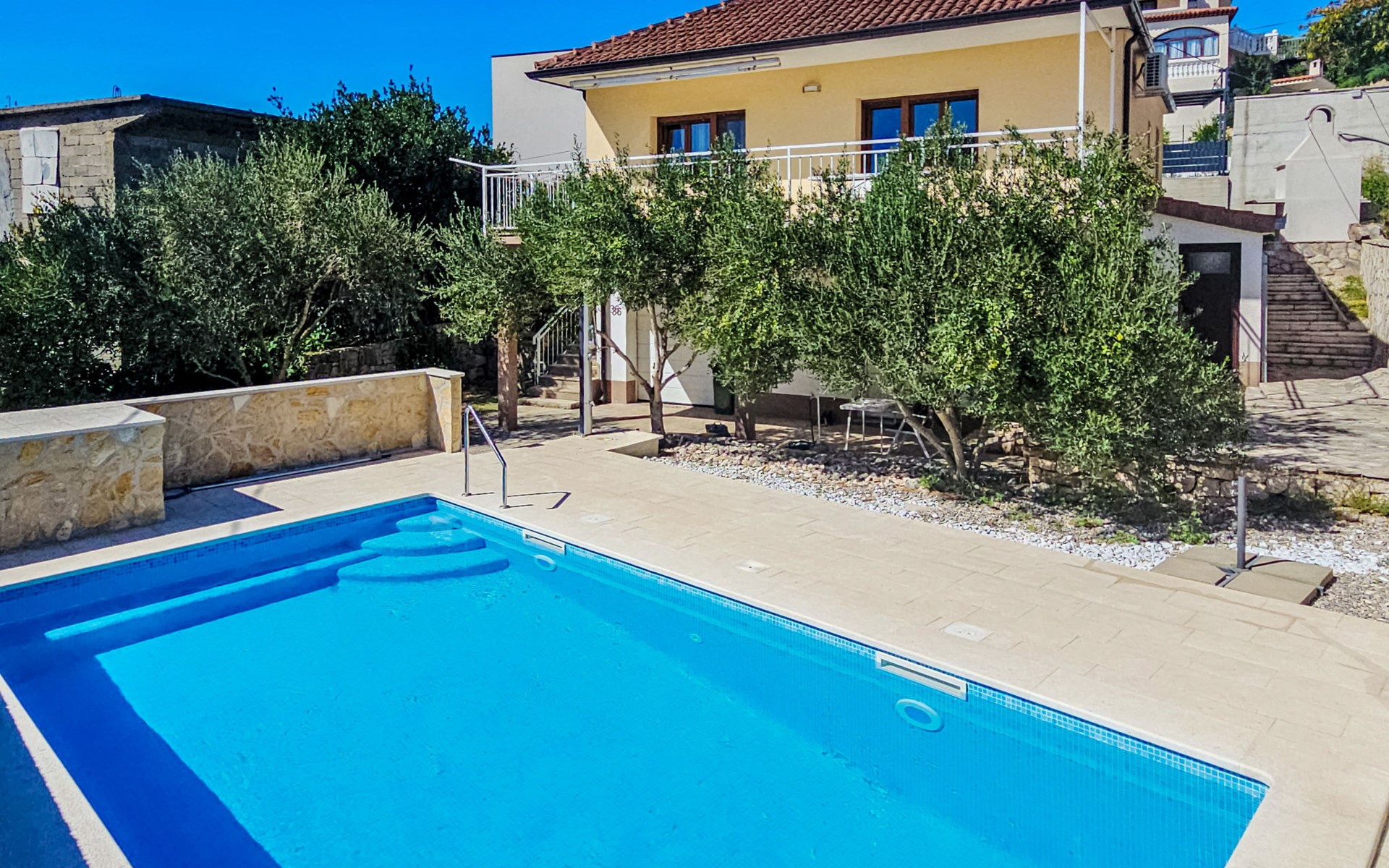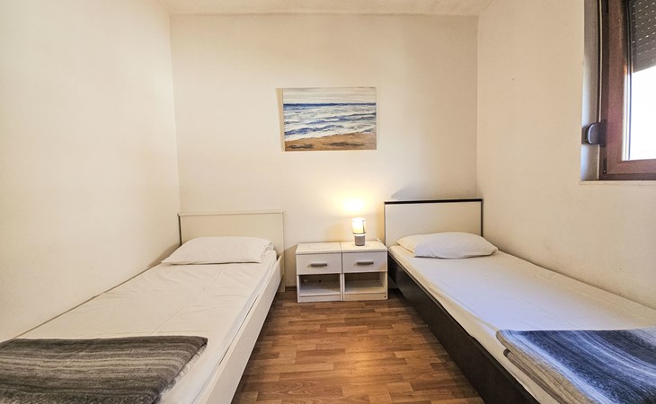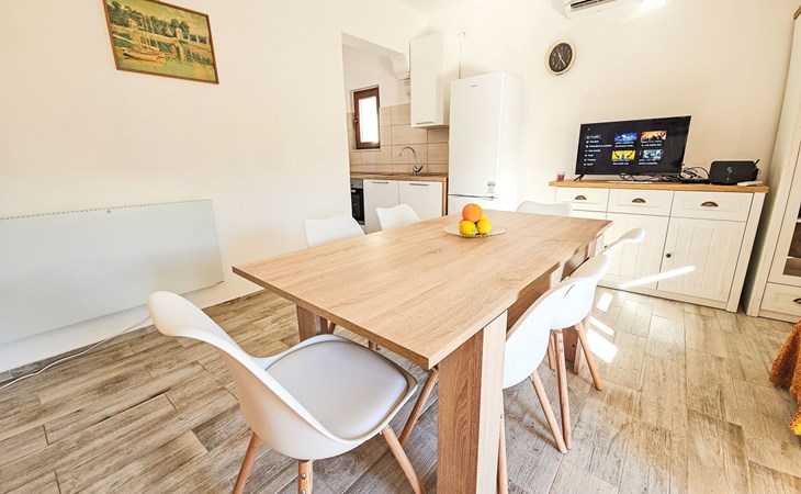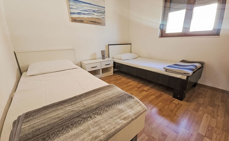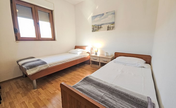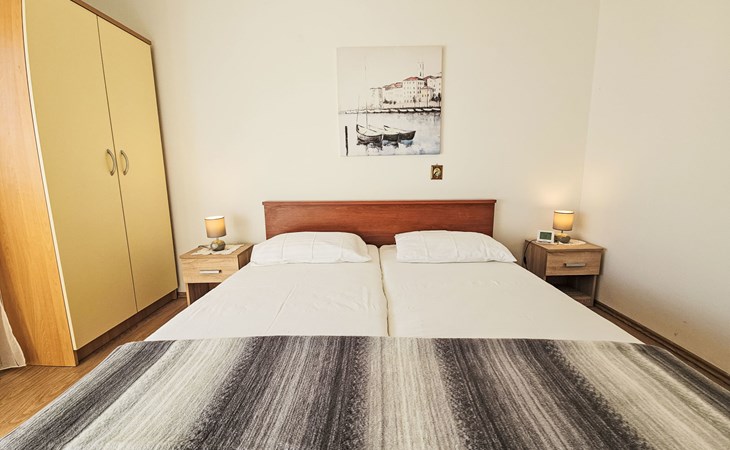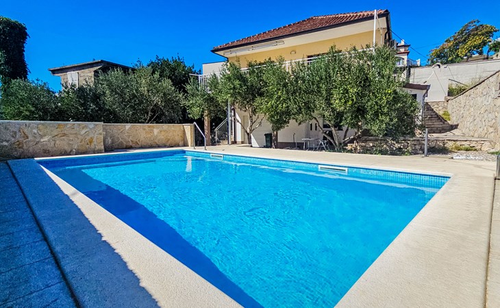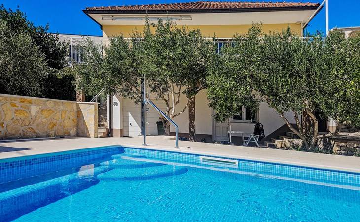 Eengezinswoning "Palada". 700 m van het centrum van Marina, rustige, zonnige ligging, 500 m van zee, 1 km van het strand, aan een doodlopende weg. Voor alleengebruik: terrein 400 m2 (omheind), openluchtzwembad hoekig (7 x 3 m, 150 - 170 cm diepte, seizoensgebonden beschikbaarheid: 01.Mei. - 01.Okt.) met trap. Buitendouche, terras (30 m2), tuinmeubelen, barbecue. In het huis: internetaansluiting, wasmachine. Parkeerplaats (voor 2 auto's) bij het huis op het terrein. Winkel 500 m, restaurant 800 m, bushalte 400 m, kiezelstrand 1 km, rotsstrand 1 km. Jachthaven 600 m, tennis 10 km.
