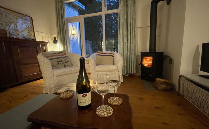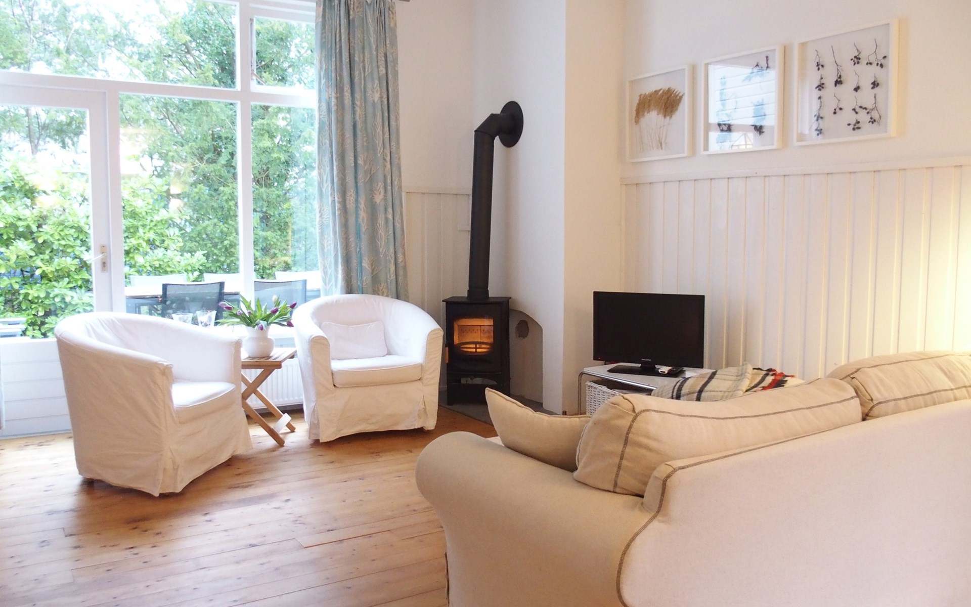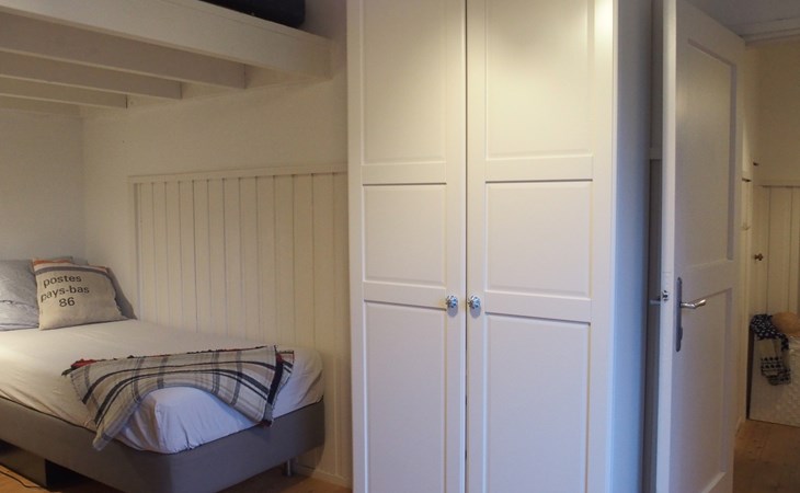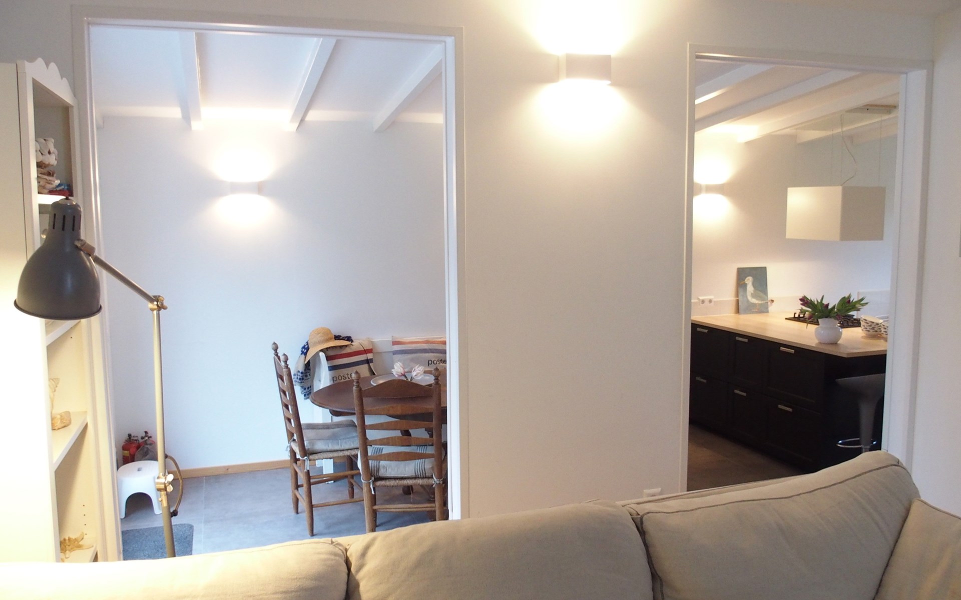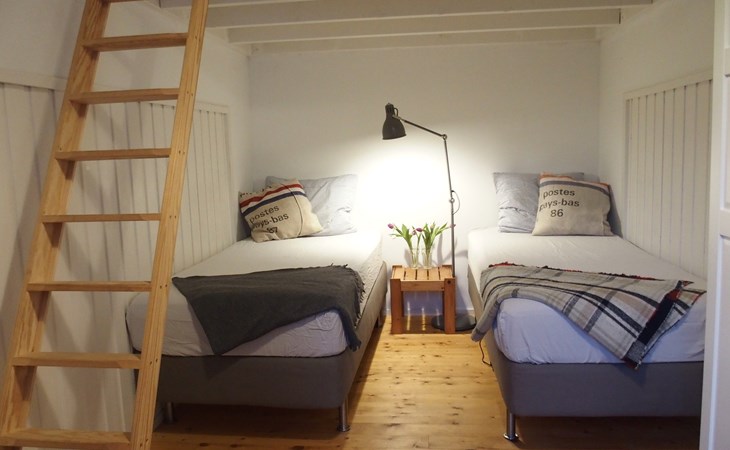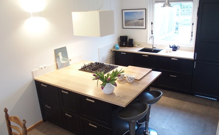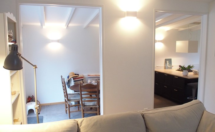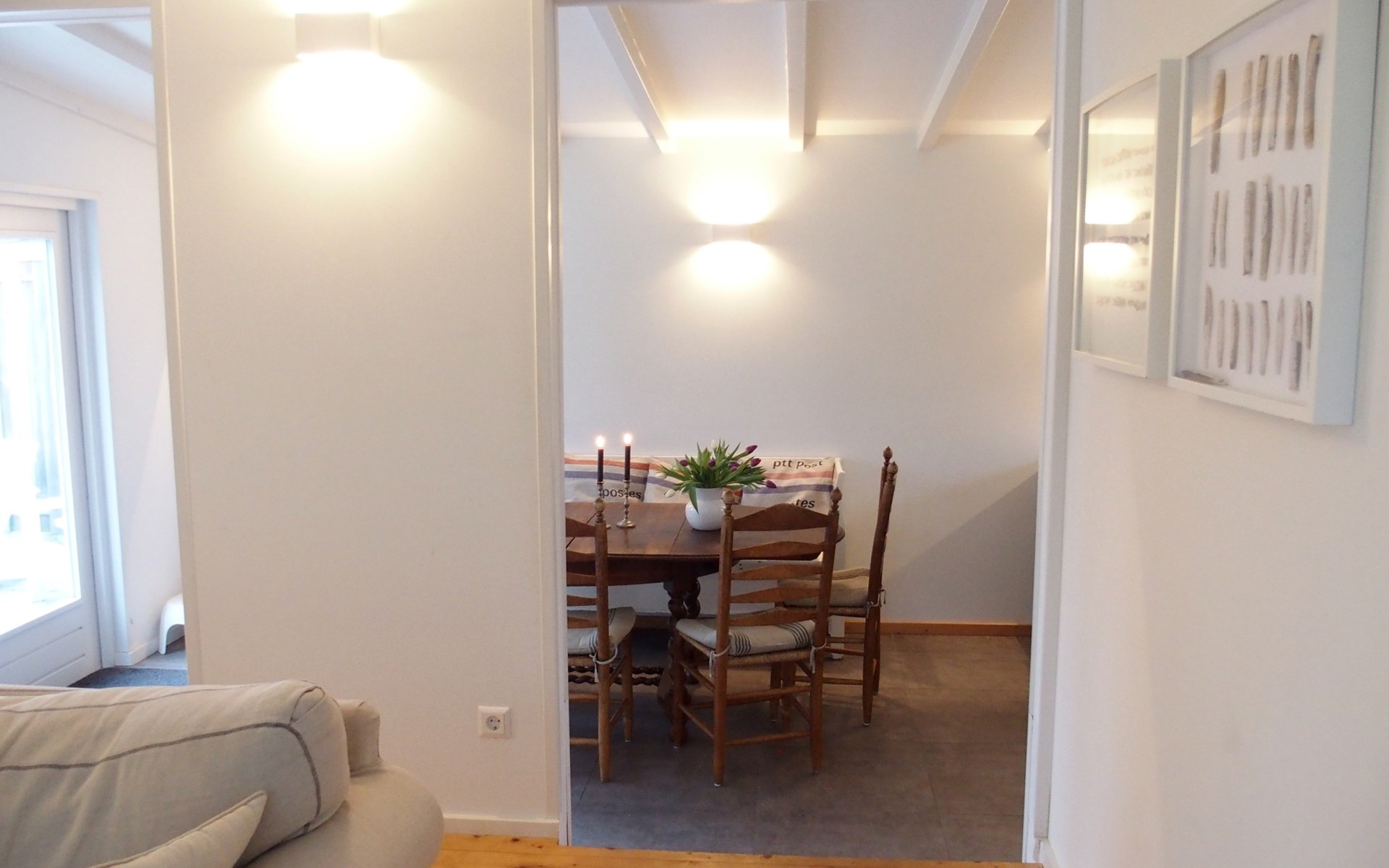 Via de hal komt u in de woonkamer. Hier is een gezellige zithoek met kleine houtkachel. Vanuit de woonkamer kunt u via de tuindeur naar één van de terrassen met eettafel. Aansluitend aan de woonkamer ligt iets verdiept de ruime woonkeuken met eethoek. De keuken is voorzien van alle moderne gemakken. Via de openslaande tuindeuren kunt u zo de achtertuin in lopen. Hier is een tweede terras. Vanuit de hal heeft u toegang tot de eenvoudige, kleine badkamer met inloopdouche, wastafel, wc, wasmachine en wasdroger. Ook komt u via de hal in de twee slaapkamers. Eentje met een tweepersoonsbed met twee aparte matrassen (2x 90x200) en eentje met twee eenpersoonsbedden (90x200) en een vide met nog twee eenpersoonsmatrassen op een lage lattenbodem. Dit is een super slaapplek voor kinderen vanaf een jaar of 8 (vanwege de steile trap).
