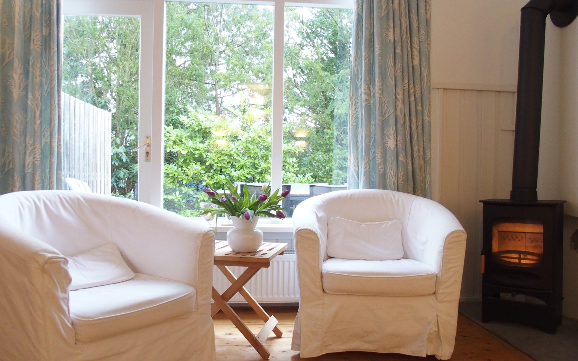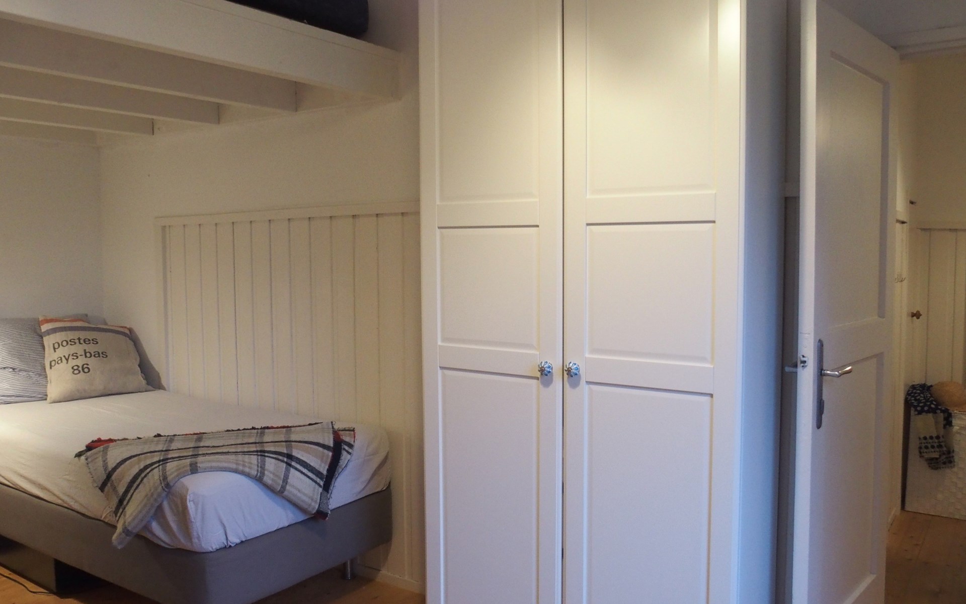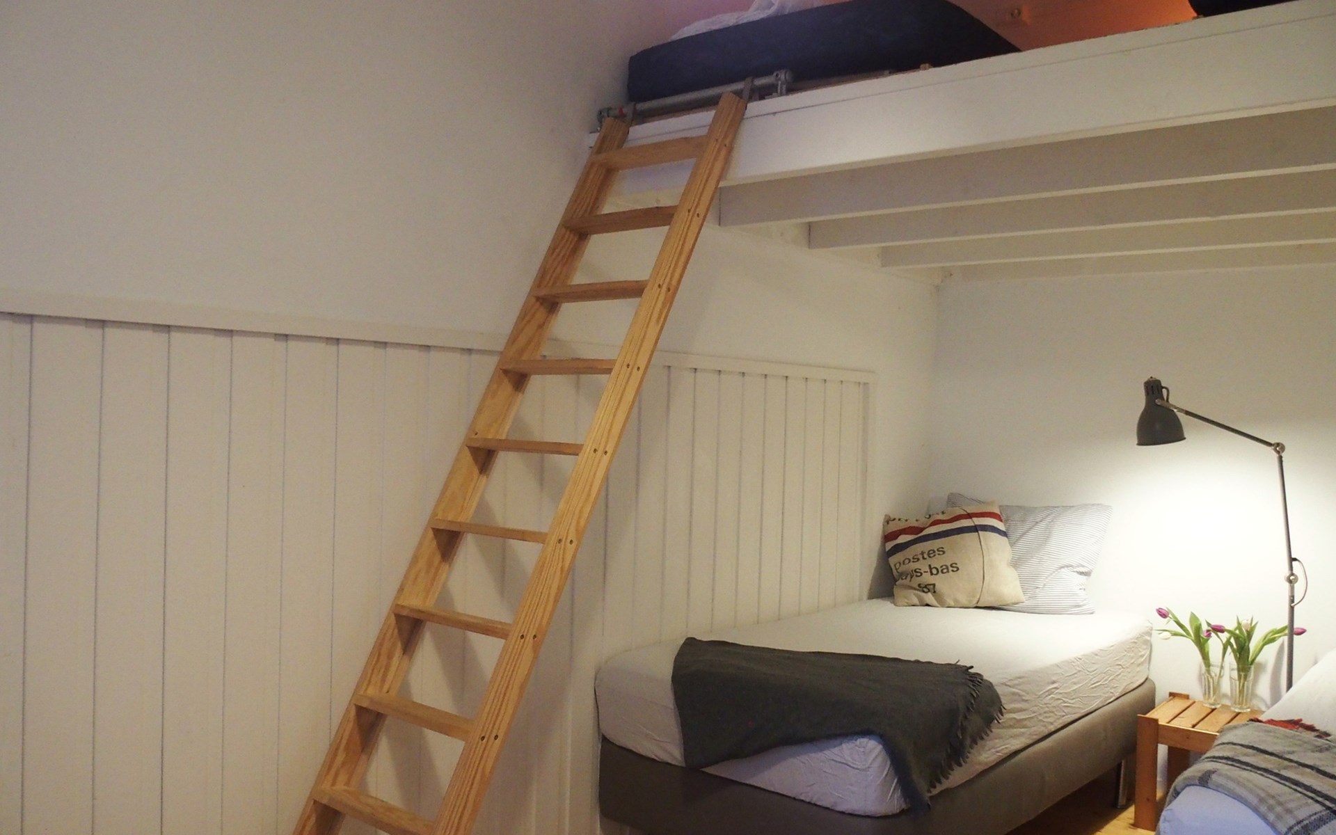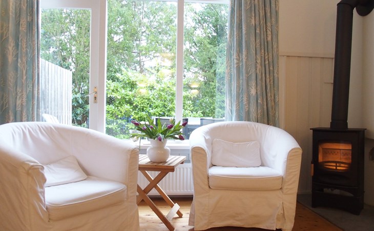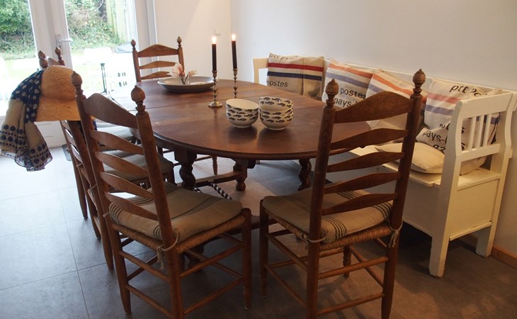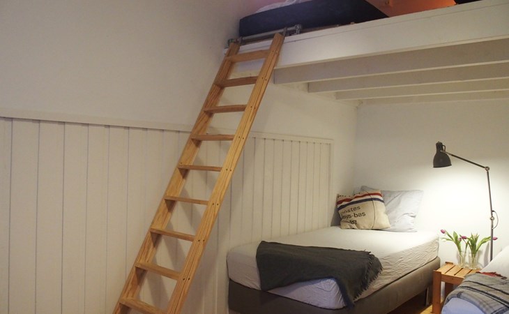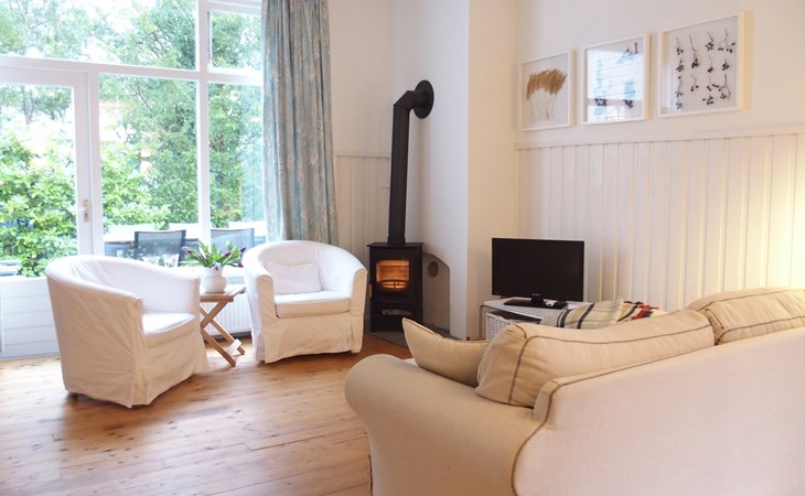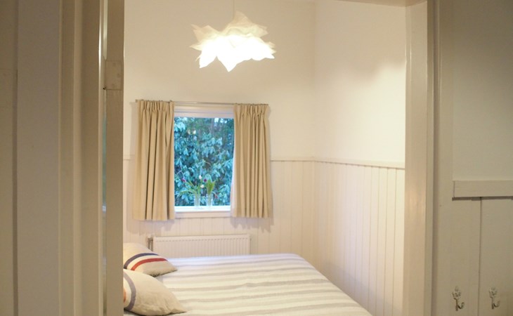Via de hal komt u in de woonkamer. Hier is een gezellige zithoek met kleine houtkachel. Vanuit de woonkamer kunt u via de tuindeur naar één van de terrassen met eettafel. Aansluitend aan de woonkamer ligt iets verdiept de ruime woonkeuken met eethoek. De keuken is voorzien van alle moderne gemakken. Via de openslaande tuindeuren kunt u zo de achtertuin in lopen. Hier is een tweede terras. Vanuit de hal heeft u toegang tot de eenvoudige, kleine badkamer met inloopdouche, wastafel, wc, wasmachine en wasdroger. Ook komt u via de hal in de twee slaapkamers. Eentje met een tweepersoonsbed met twee aparte matrassen (2x 90x200) en eentje met twee eenpersoonsbedden (90x200) en een vide met nog twee eenpersoonsmatrassen op een lage lattenbodem. Dit is een super slaapplek voor kinderen vanaf een jaar of 8 (vanwege de steile trap).