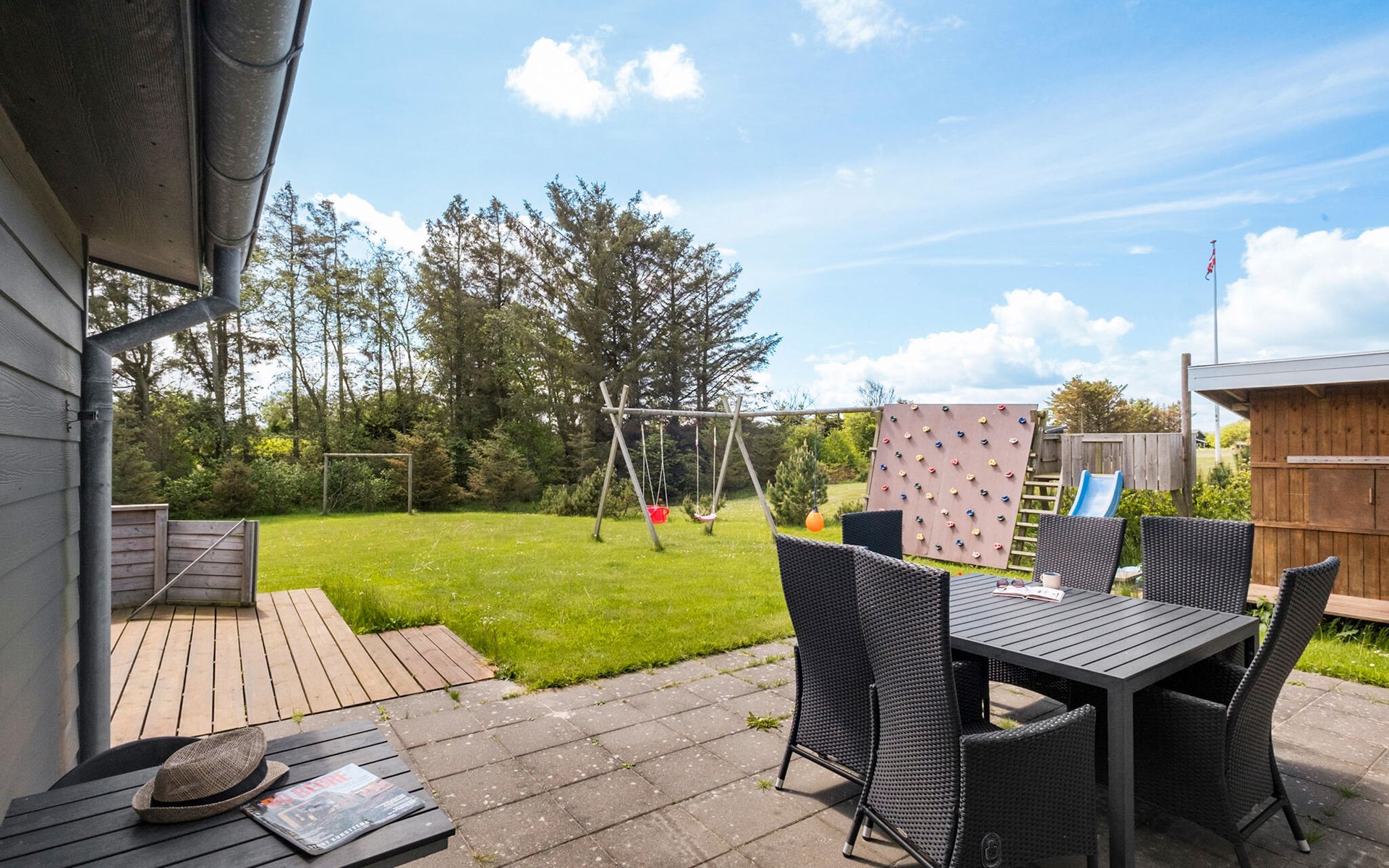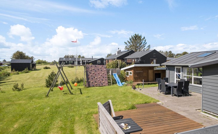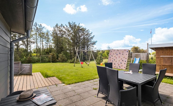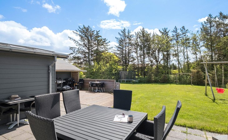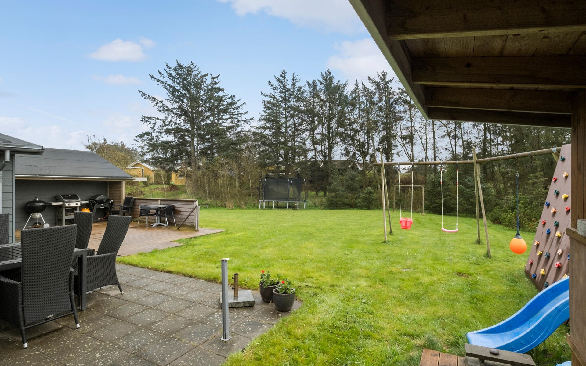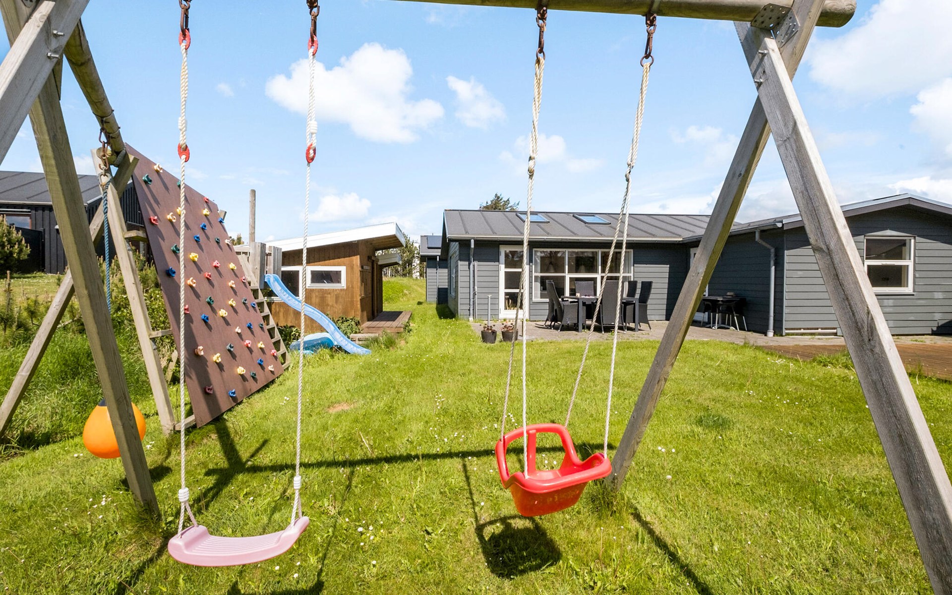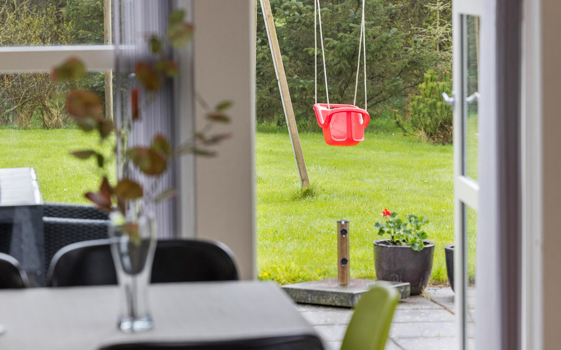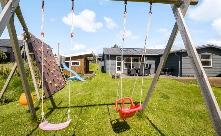 Geniet van de buitenruimte met een groot gazon en verschillende zitjes. Ontbijt op het terras, ontspan op de ligstoelen of barbecue samen op warme zomeravonden. Kinderen zullen genieten van de glijbaan, klimmuur, schommels en trampoline, terwijl de schuilhut ruimte biedt om te spelen en tijd door te brengen in weer en wind.