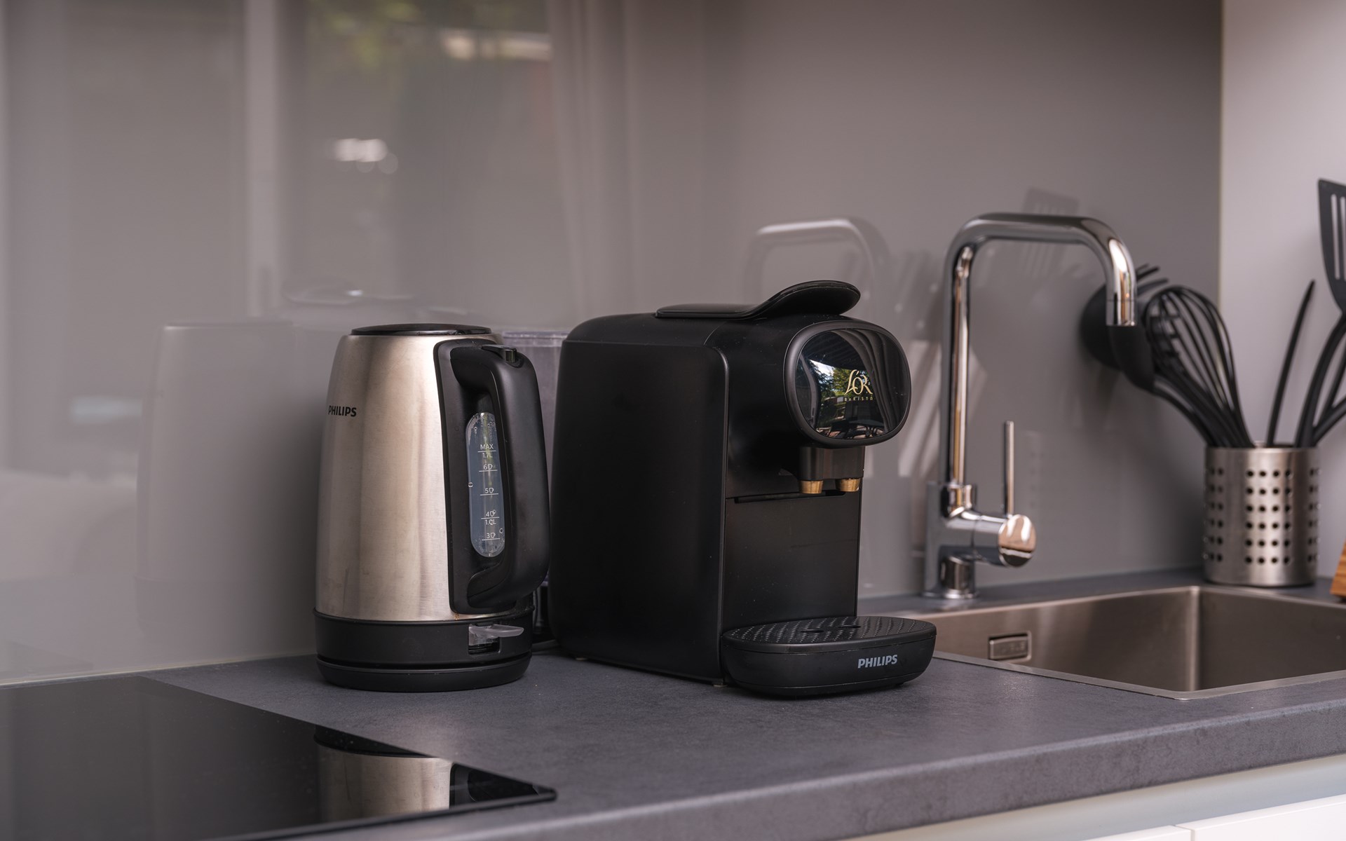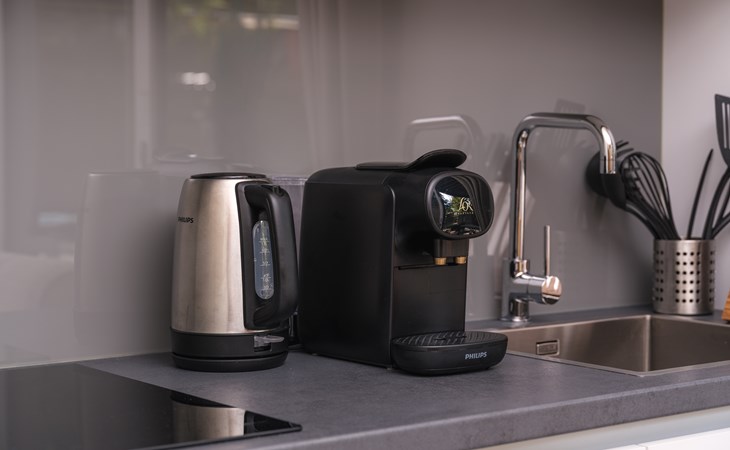 De compacte keuken biedt alles om een eenvoudige maaltijd te bereiden, en de moderne badkamer is voorzien van een ruime douche, toilet en stijlvol wastafelmeubel.